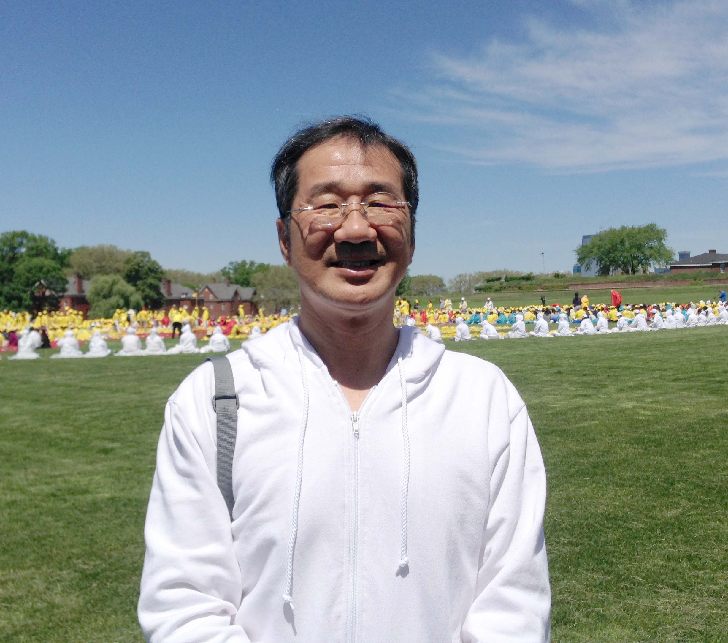 在纽约总督岛排字现场,来自台湾阿里山的林先生和两个女儿在等待进入场地,和五千名法轮功学员一起组成大型彩色的法轮图形和金黄色的“真善忍”组图。林先生感谢师父,修炼法轮大法使他身心受益,太太和两个女儿也相继走入修炼。