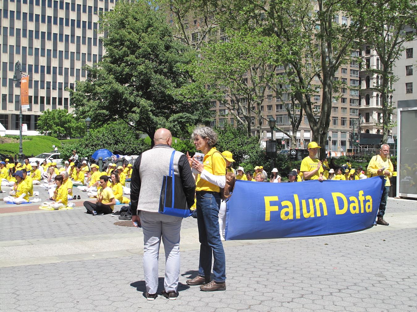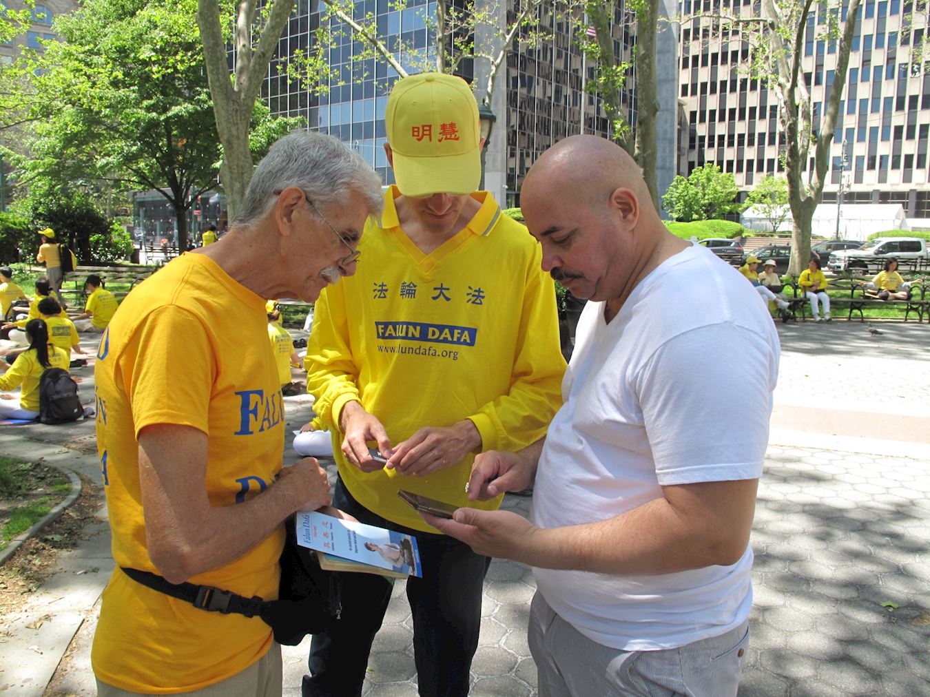 ![]() 图2:国际金融服务公司(WFG)保险代理人贾维尔·维加(Javier Vega)在富利广场(Foley Square)遇到正在集体炼功的法轮功学员,一位德国法轮功学员给他讲真相 |