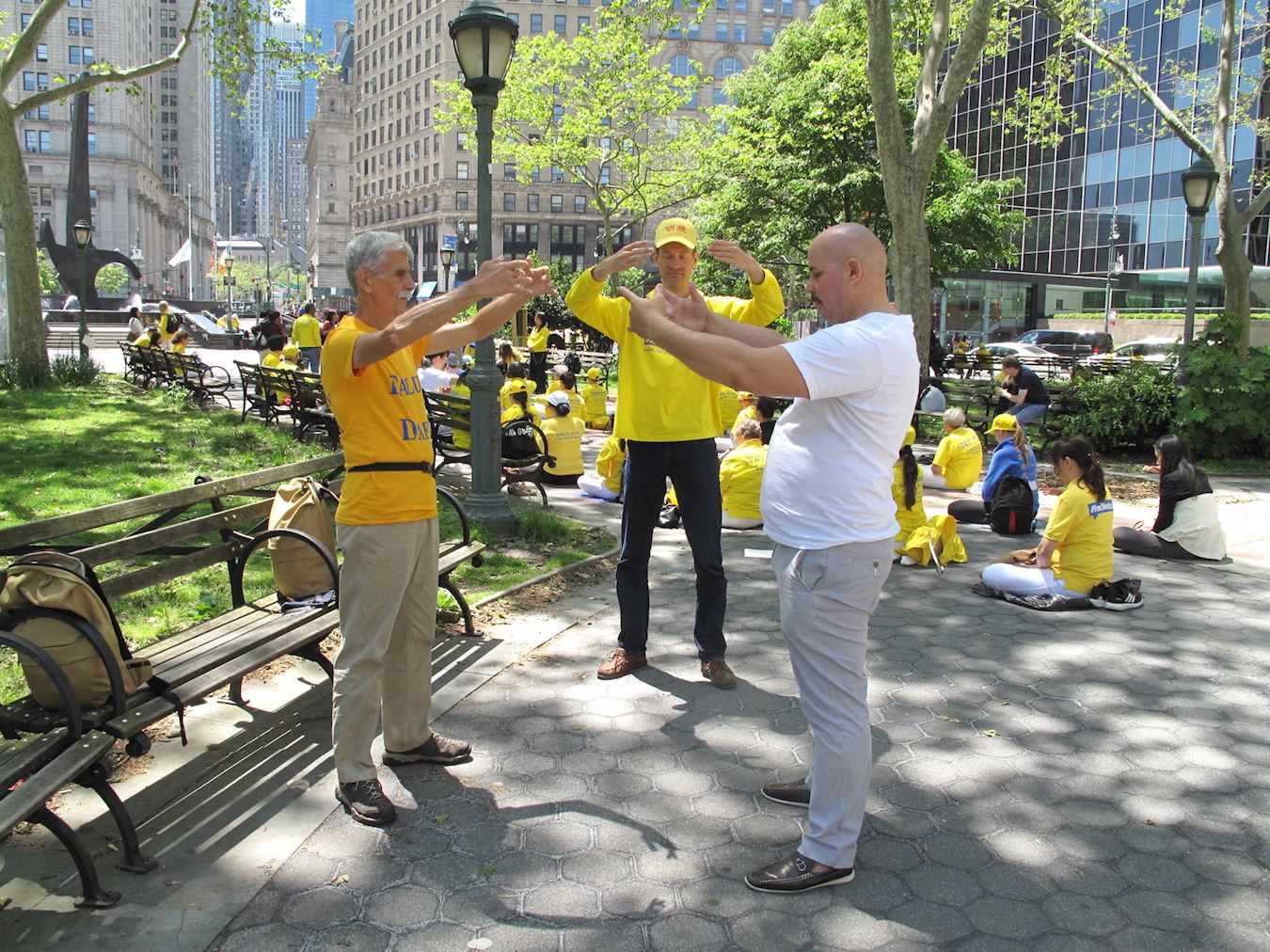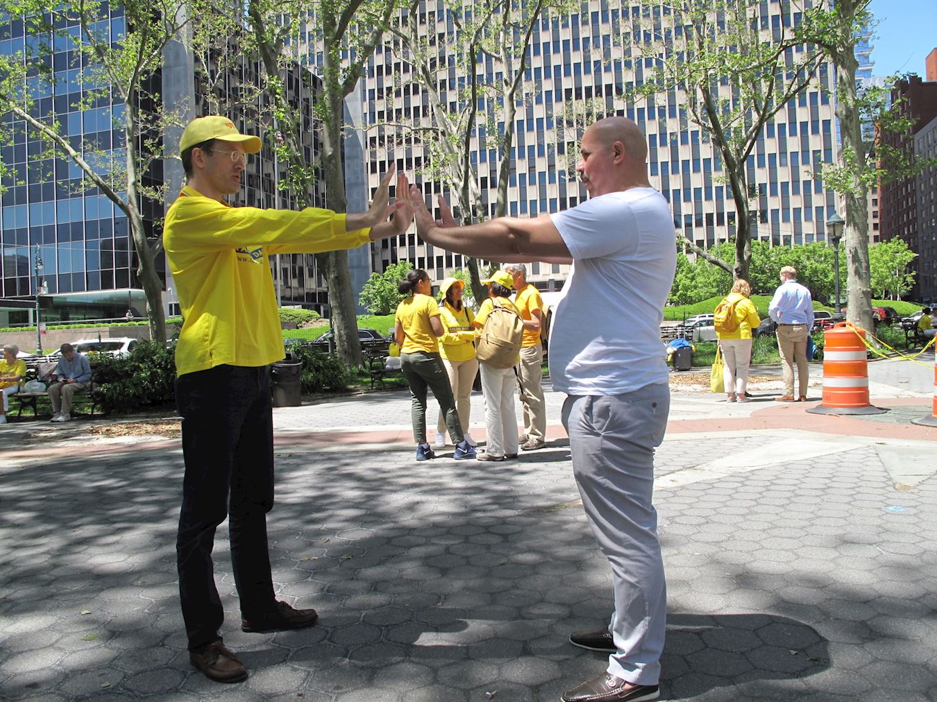 二零一九年五月十八日,参加第二十届世界法轮大法日庆祝活动的部份法轮功学员,在纽约富利广场(Foley Square)集体炼功,向美国社会民众和各国游客展示法轮功的美好,有民众当场学炼法轮功,贾维尔·维加(Javier Vega)就是他们当中的一个,与他有缘初次相遇的法轮功学员帮助他立即感受到法轮大法的神奇和博大精深。