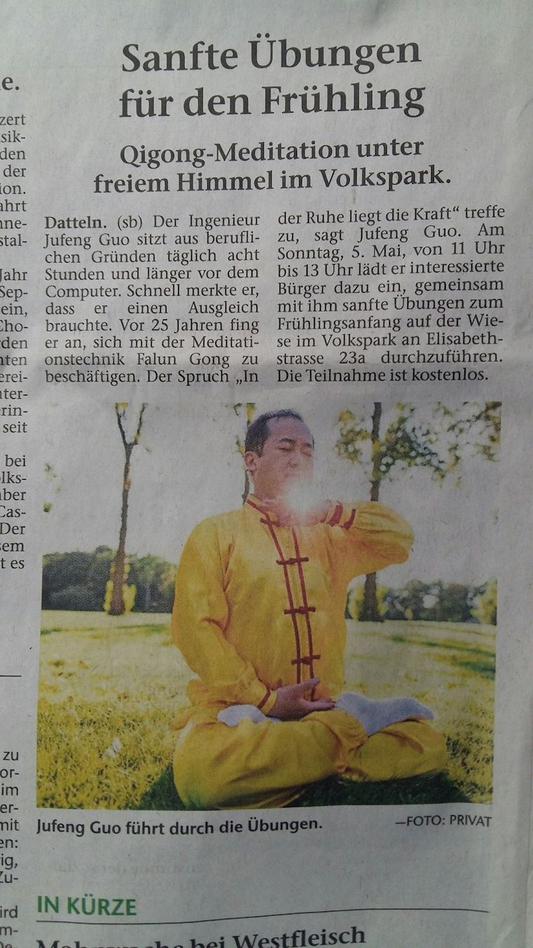 文章还介绍道:组织这个活动的是来自吕嫩市的郭居峰,他住在德国十年了,是一名工程师,他炼法轮功二十多年了。他的工作是和机器打交道。他说:“法轮功不止是让他打坐休息的一种方式,同时也是他和大自然联系起来的一种方式,享受大自然。我的心变得安静,身体充满能量。”水公园的这一天天气特别好,艳阳高照,气氛非常祥和。郭先生首先让参加者阅读一段文字(法轮功每套功法的功理),然后他介绍法轮功也叫法轮大法,他是一种有关气功的打坐,真、善、忍的法理是法轮功很重要的一部份。