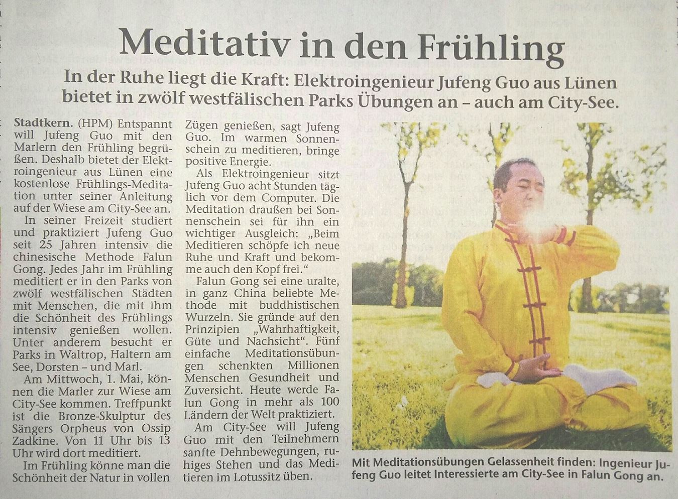 拥有一百七十四年历史(1845年建报)的百年报纸《光明之路日报》(Hellweger Anzeiger)的报纸以《法轮功的活动:水公园里的积极的打坐》为标题报道了法轮功。报道中说,在水公园湖边的草地上,人们在站成一圈,随着舒缓的音乐炼功。这是关于法轮功的一个活动,来自中国的打坐。两个小时里,参加者在祥和的音乐下炼功。在这期间,孩子们在旁边玩耍,有的行人停下来,拿起法轮功的传单阅读。