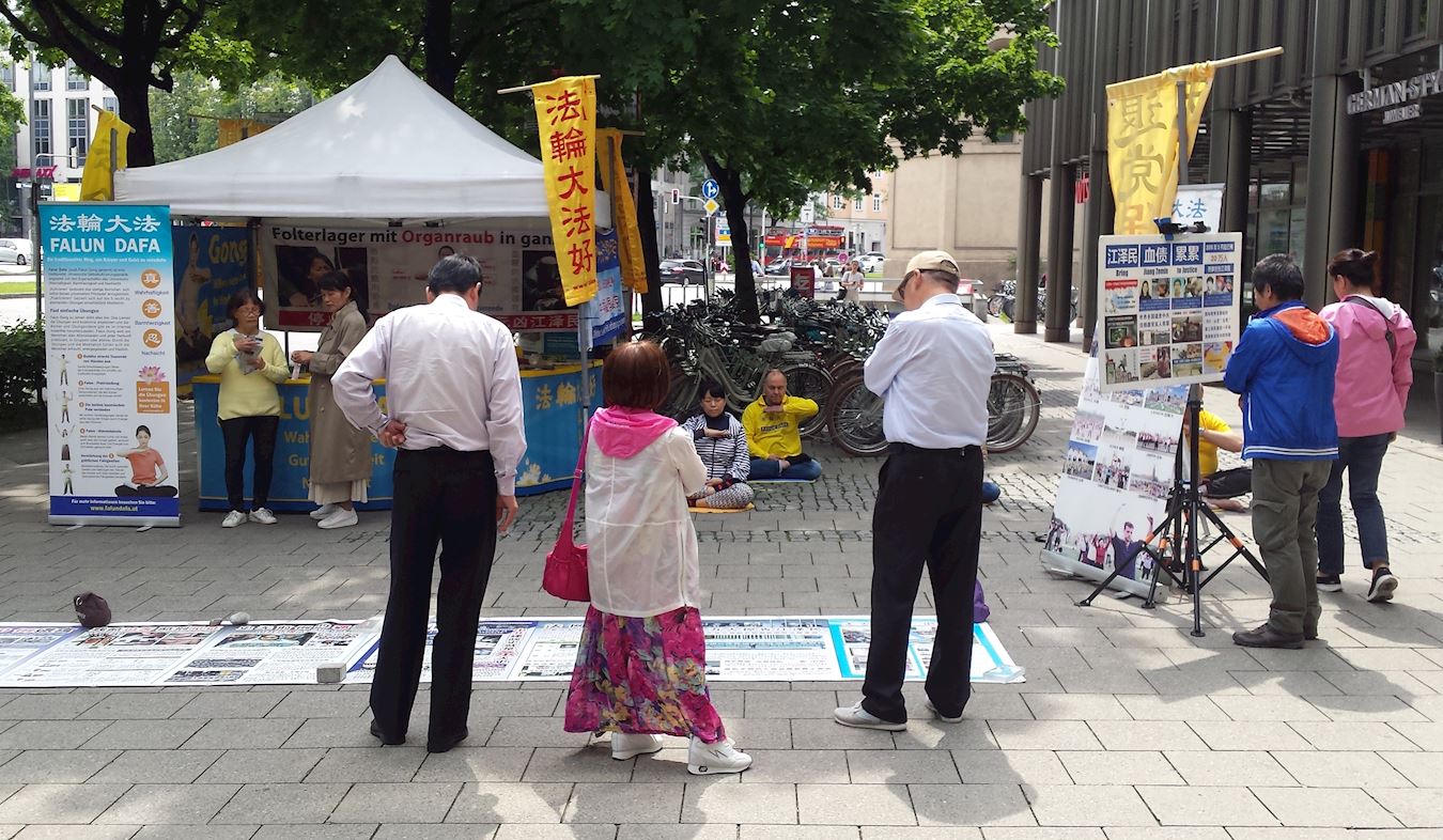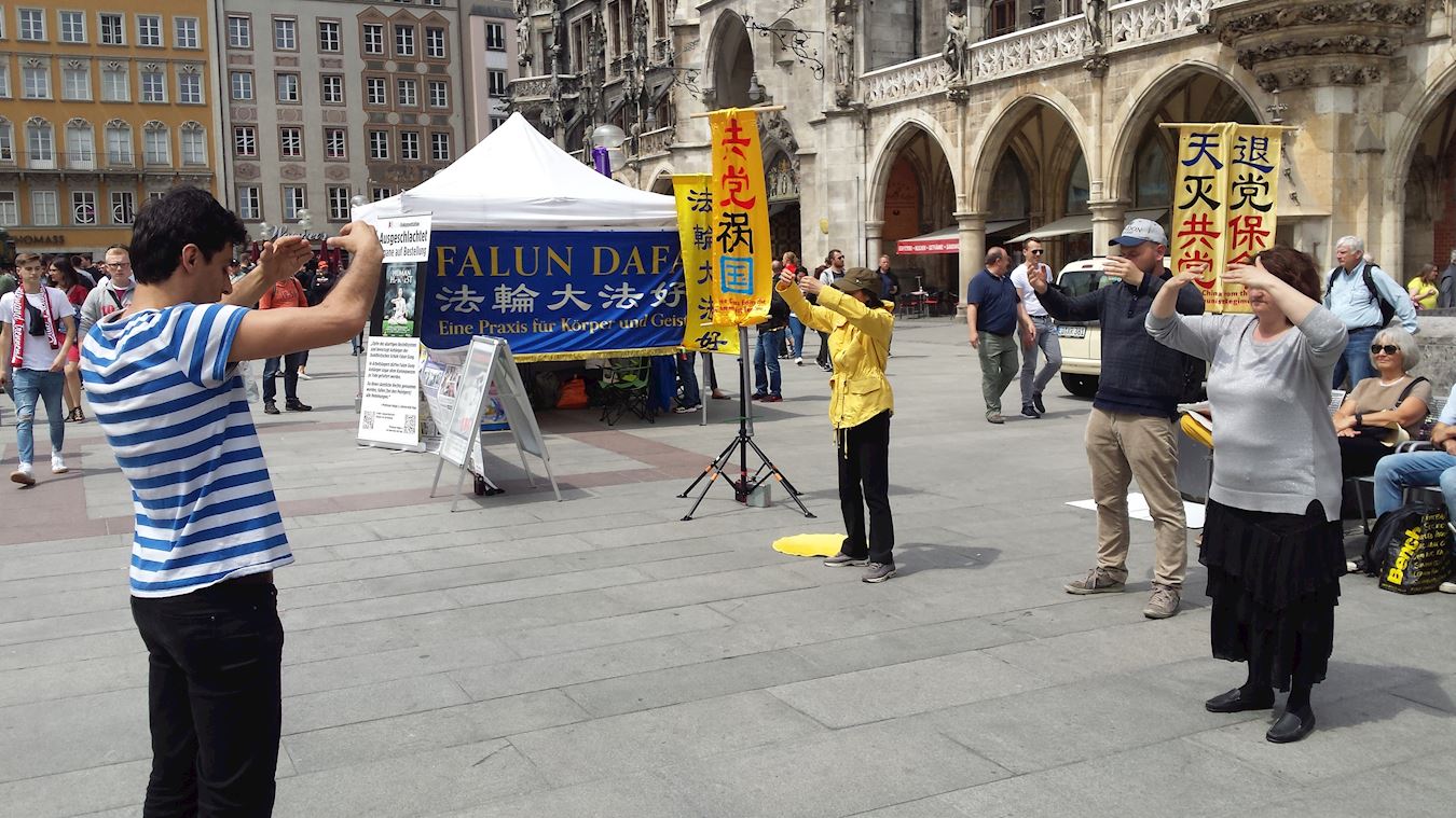 二零一九年五月十八日,法轮功学员在慕尼黑市中心玛琳广场摆出信息台和展板,学员们进行功法演示,展示给市民和游客法轮功的美好,并揭露中共迫害法轮功以及活体摘取法轮功学员器官的罪恶。