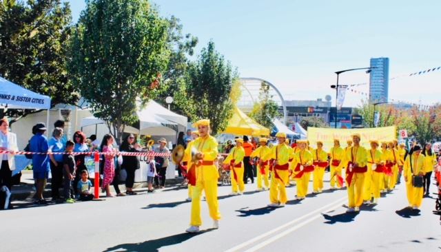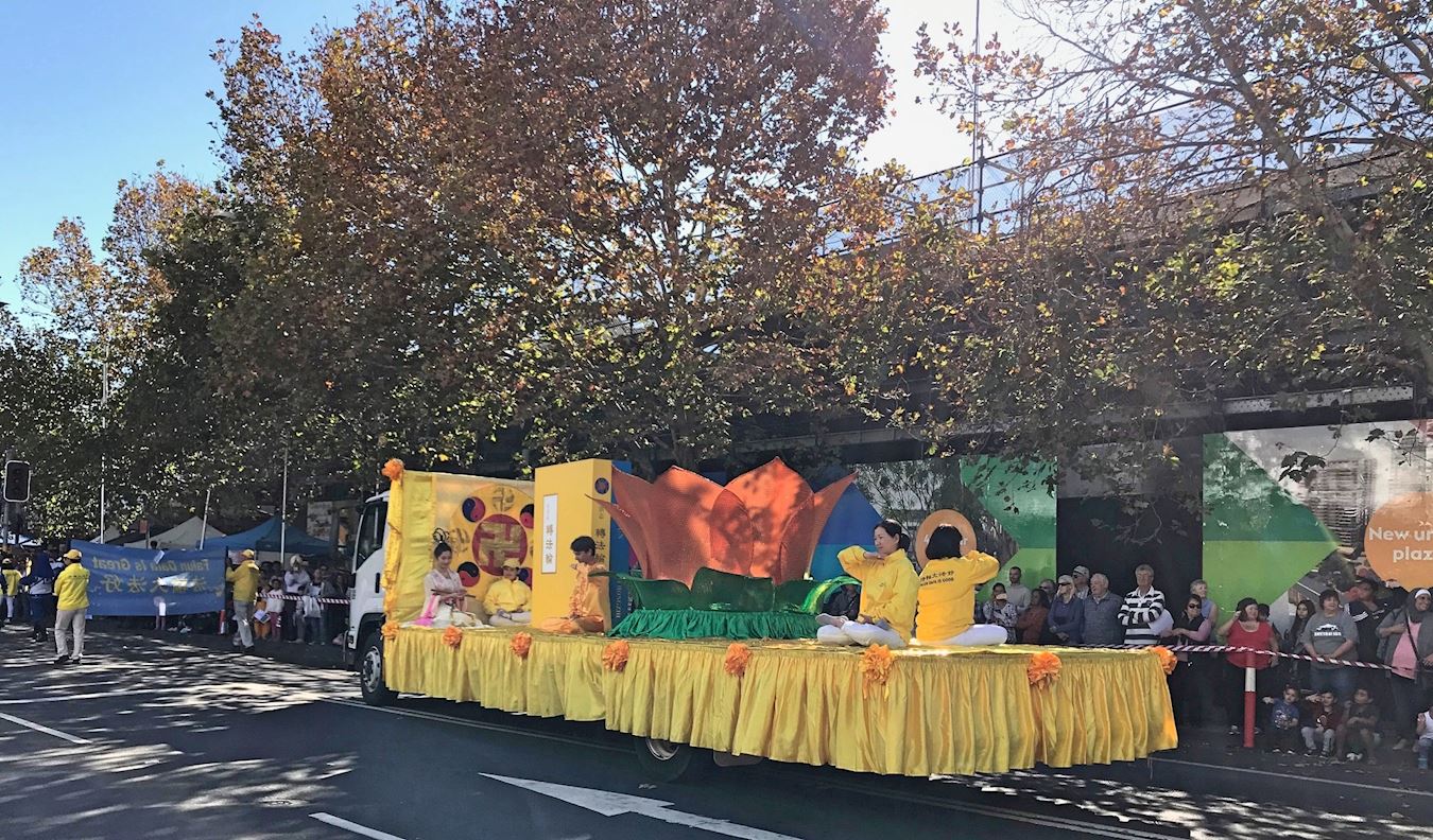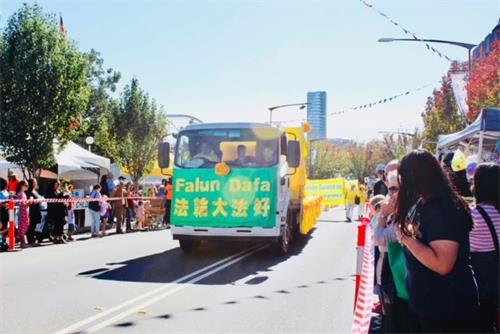 今年的法轮功队伍由天国乐团、花车和腰鼓队组成。“法轮大法好”、“法轮大法弘传一百多个国家”、“世界需要真、善、忍”等中英文横幅和彩旗在初秋的阳光中闪烁着光芒,他们所到之处赢得道路两旁市民们的掌声和赞扬声。数万名观众不但现场感受到法轮大法的美好祥和,人们还把这风貌竞相拍摄、合影,带回去分享给亲朋好友。