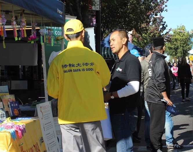 在某社区电台工作的约翰(John)曾听闻法轮功,当天路过法轮功展位,想进一步了解法轮功是什么?法轮功学员向约翰介绍了法轮功是以“真、善、忍”为原则,通过修炼可以提升人的道德标准,使身心都受益的修炼功法。约翰询问:那为什么中国人不喜欢呢?法轮功学员回答:不是中国人不喜欢,而是中共邪*党-不喜欢。就是因为当年中国人非常喜欢法轮功了,炼的人非常多,引起了中共党魁江泽民的嫉恨,开始镇压法轮功,不让人炼。从一九九二年法轮功传出至一九九九年打压之前,已有近一亿人在炼法轮功。