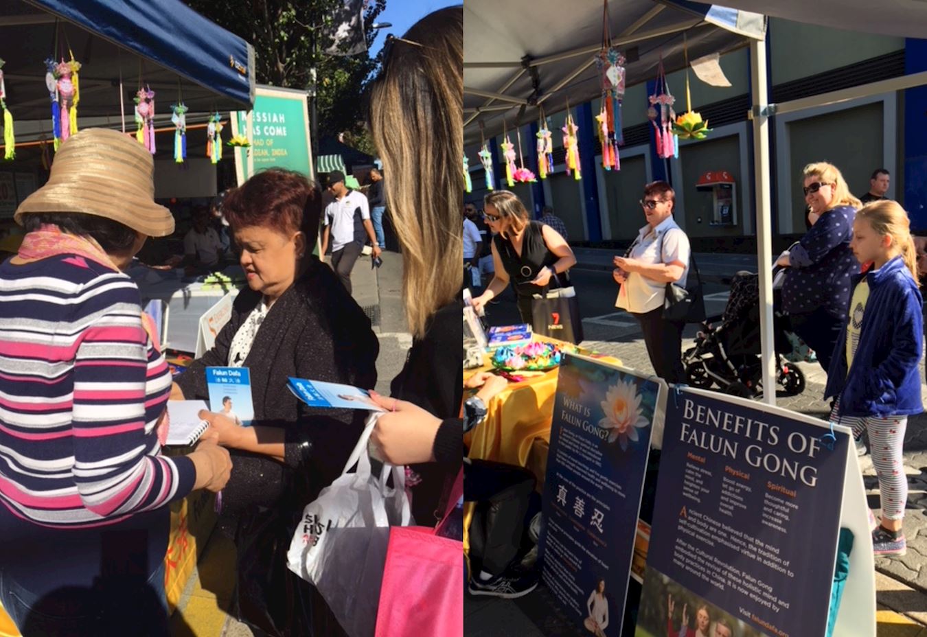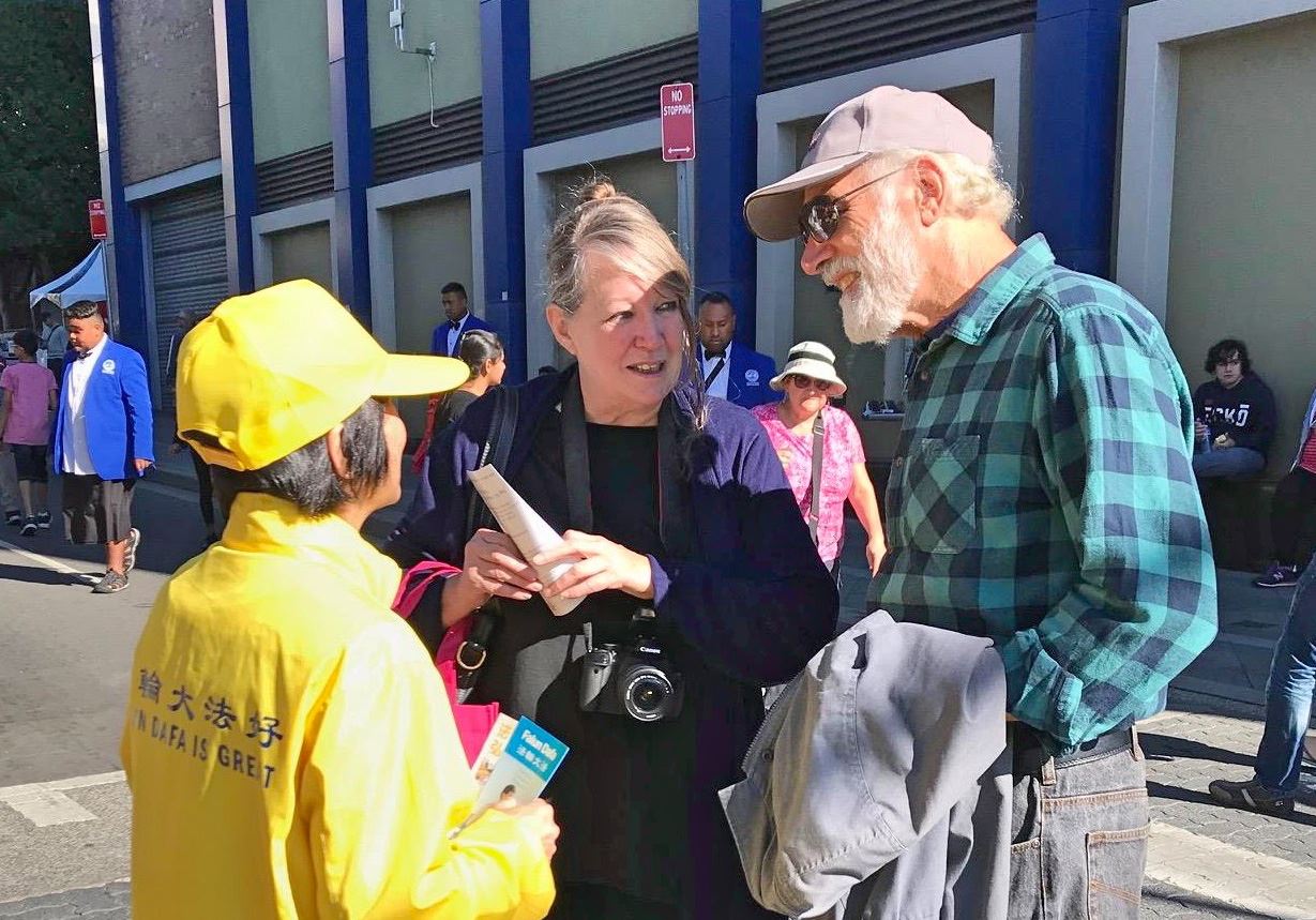 路人特雷西(Tracy)路过法轮功展位,被美丽的莲花吊坠吸引,想了解法轮功,她说:“炼功和打坐对身体和灵魂都会有好处,能给你带来很好的精神与祥和的心态,所以我想一定是很不错的。”