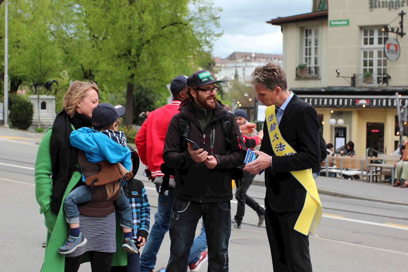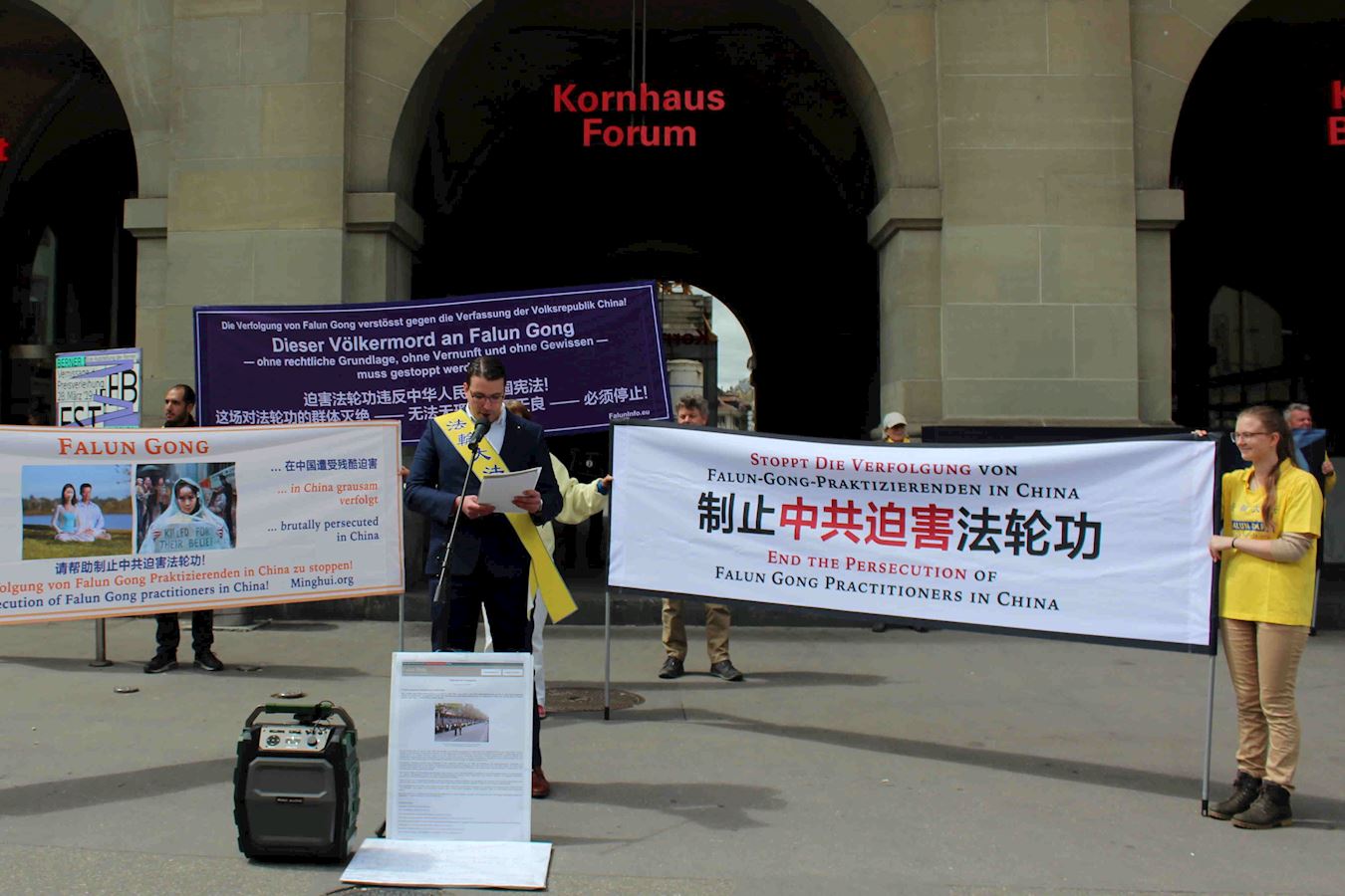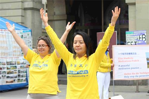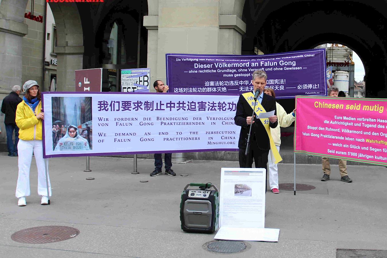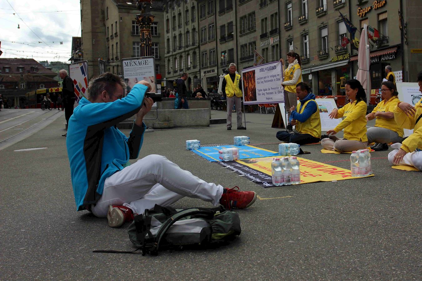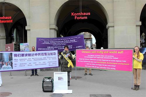 ![]() 图1~5:法轮功学员在首都伯尔尼古城集会,通过演讲并打出横幅让人了解法轮功真相。 |