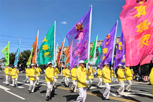 当色彩缤纷的彩旗队方阵出场时,在阳光照射下,印有“真、善、忍”的彩旗格外鲜艳。观赏游行已有40年的Rose McLean女士非常喜爱法轮功学员的彩旗队,称其为游行带来亮丽和光明。