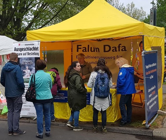 二零一九年四月二十八日,德国卡塞尔市(Kassel)举行了“世界地球日”的庆祝活动。当地及周边地区的法轮功学员在这个活动中搭建了信息点,演示功法,向民众们介绍法轮功并讲述中共对法轮功迫害的真相。许多民众被学员们的活动吸引,很多人为支持法轮功反迫害签名,还有许多人咨询哪里可以学炼功法。