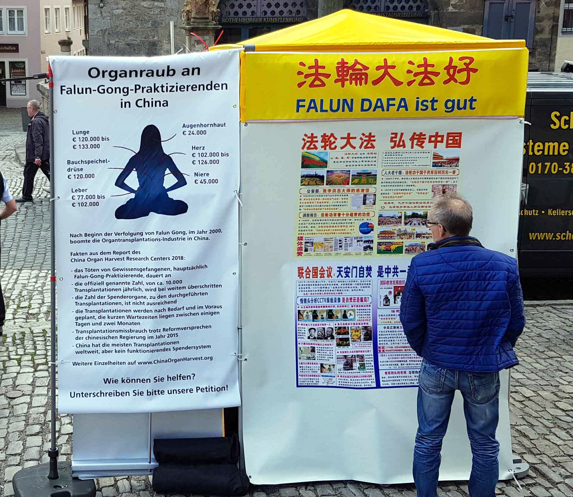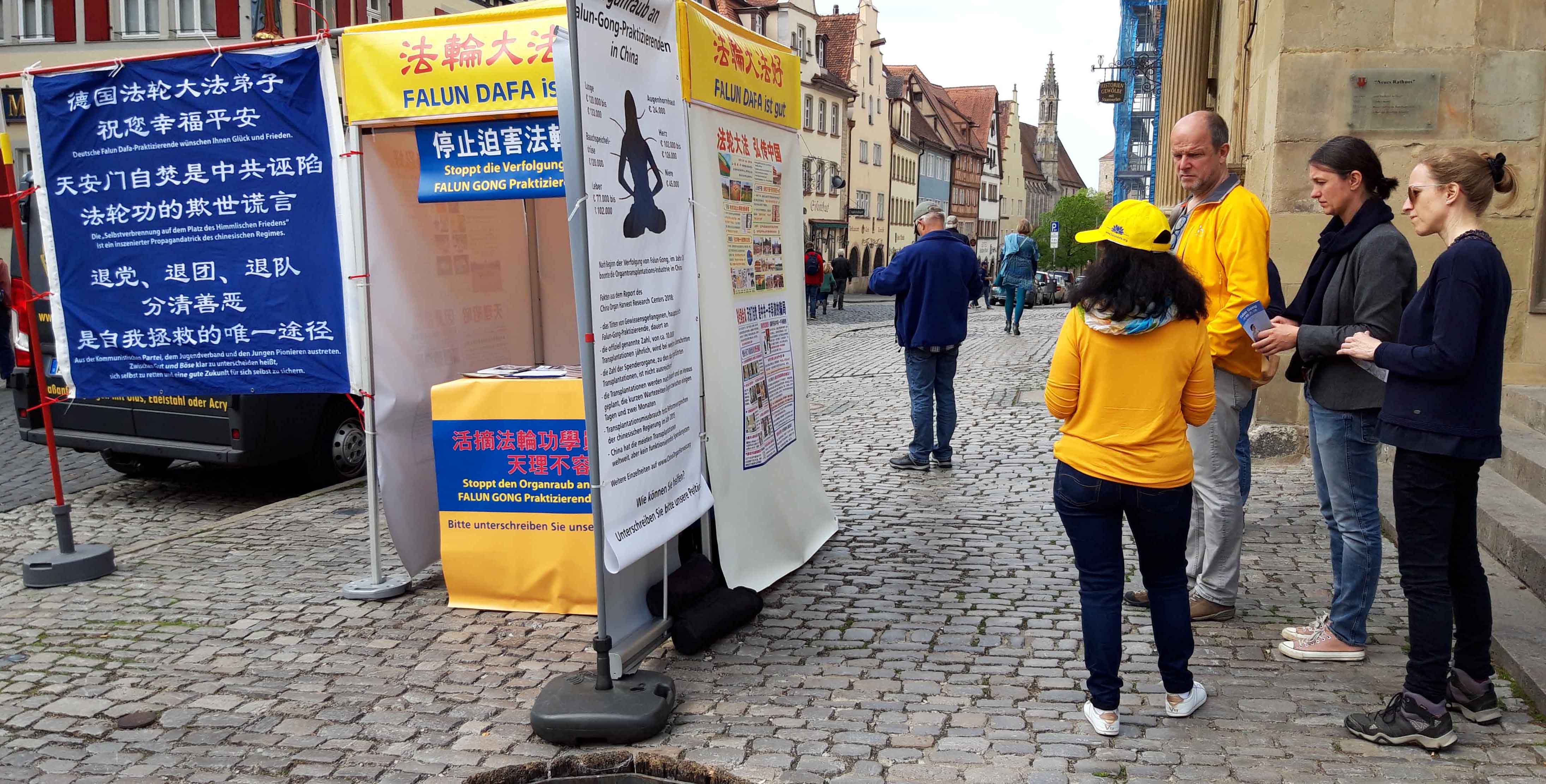 罗滕堡(Rothenburg ob der Tauber)位于德国巴伐利亚州西北部,是德国所有城市中,保存中古世纪古城风貌最完整的地区,欧洲游客特别多,也非常受来自中、台、日、韩的游客的青睐。自一月份以来,罗滕堡地区的法轮功学员每周一次在市政厅旁边设立信息点,向民众揭露中共对法轮功学员的迫害。渐渐地人们开始询问法轮功是什么,为什么会被非法迫害?