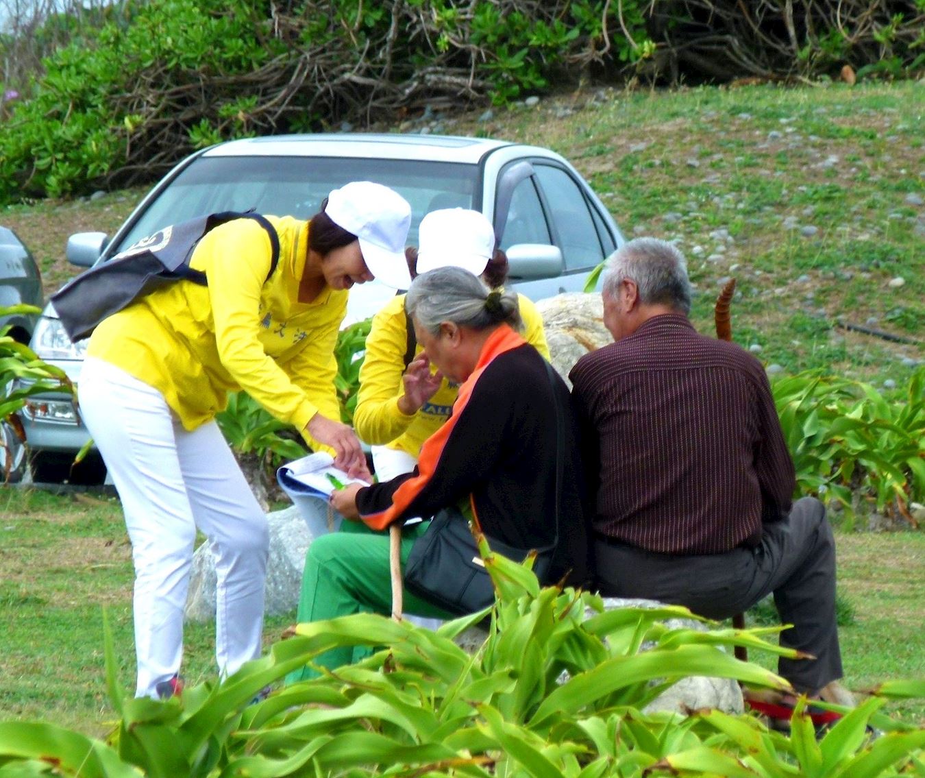 台湾东海岸的加路兰,滨临一望无际的太平洋,自然景观壮阔秀丽,是各地游客旅游东部必经之地。五日上午,天清气朗,海风徐来,浪涛拍岸,自然美景映衬着法轮功学员金黄色上衣,吸引许多游客观赏拍照,其中也有许多大陆游客。