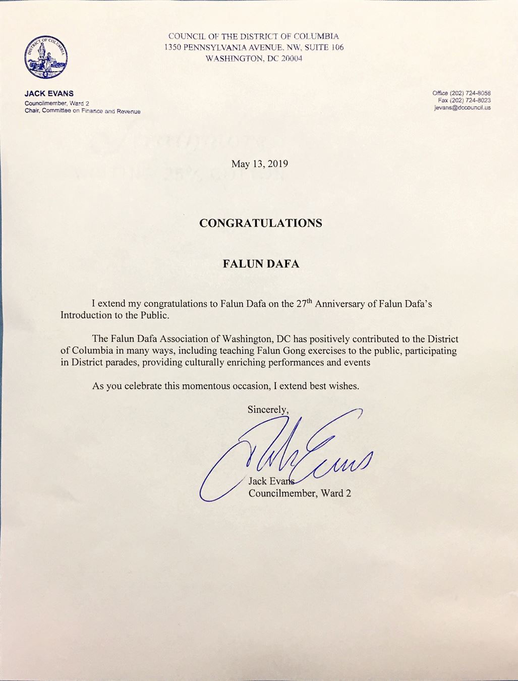 华盛顿哥伦比亚特区议会议员杰克·埃文斯(Jack Evans)祝贺法轮大法传世二十七周年。他在贺信中说:“华盛顿特区法轮大法学会以多种方式对特区做出积极的贡献,其中包括:教授民众法轮功功法,参加特区游行,并带来有着丰富文化内蕴的演出和活动。”