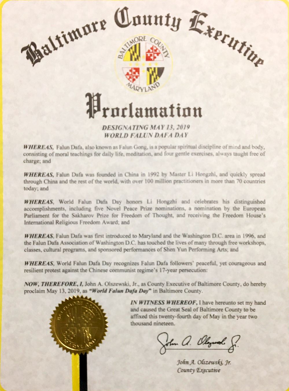 与美国首都相邻的马里兰州巴尔的摩郡郡长小约翰·奥尔泽沃斯基(John A. Olszewski,Jr.)颁发褒奖令,把二零一九年五月十三日定为巴尔的摩郡“世界法轮大法日”。