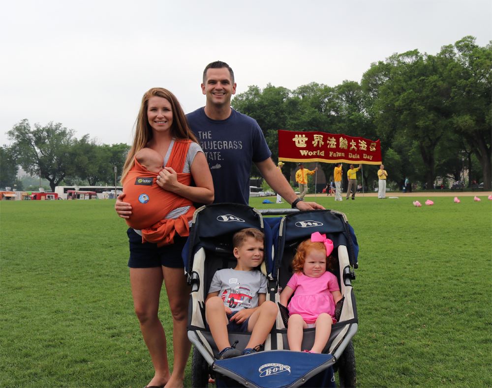贾寇伯(Jacob)带着妻子和三个年幼的孩子来到国家广场,他们被大法小弟子表演的舞蹈吸引过来。贾寇伯说:“我能感受到正的能量,非常美妙。”任职于美国国防部的贾寇伯即将被派驻日本三年。他说很高兴在动身前往日本之前,能听闻法轮大法,他回去后要查找更多有关法轮大法的真相。