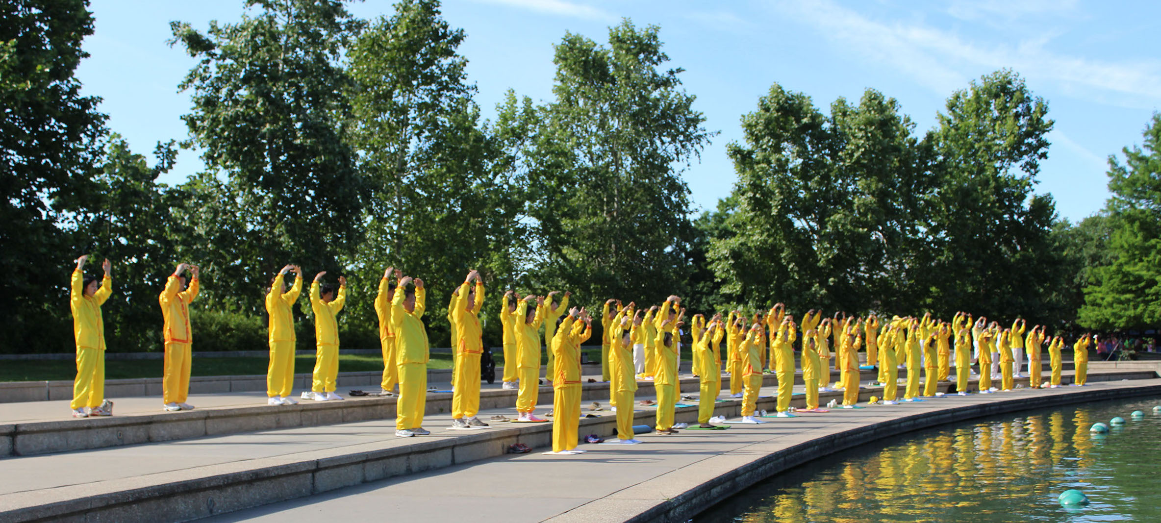荷门公园是休士顿知名公园,周末,居民来公园休闲和运动,五日上午,学员在麦克文湖边(McGovern Lake)炼功,身穿黄色炼功服,跟随炼功音乐,展示缓慢优美的 功法,成为荷门公园一道美好的风景线。祥和美好的场景,使路人驻足观看。