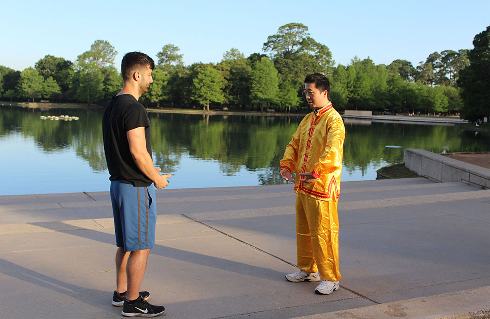 ![]() 图3:约翰先生(John 左)对法轮功感兴趣,跟随学员李先生学炼法轮功动作。 |