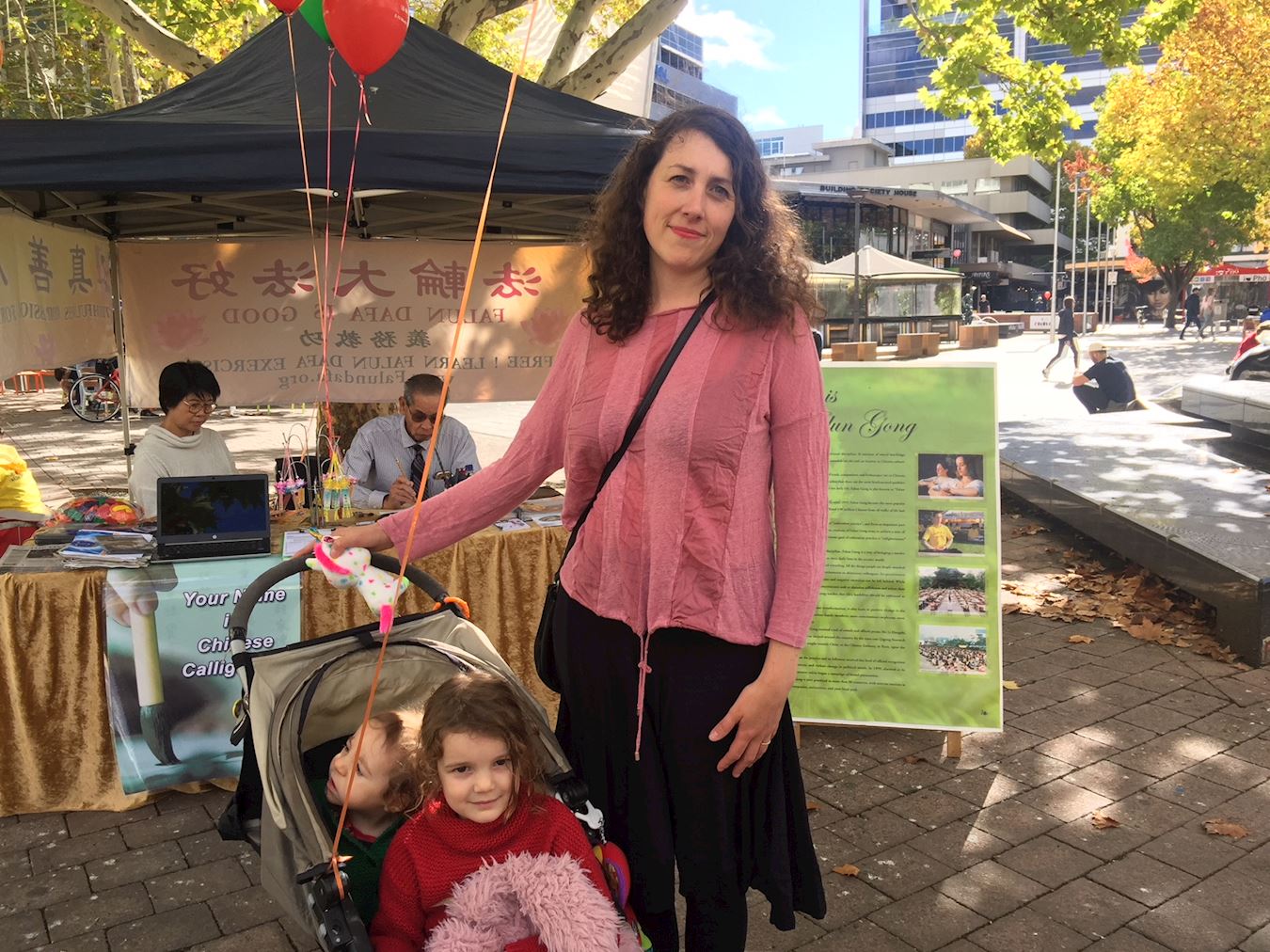有一位女士推着童车,来到法轮功学员的活动现场,主动和学员交谈,她说:“我的名字叫凯特(Kate Waterford),我很了解法轮功,因为我在国际大赦工作,是国际大赦澳大利亚分部副主席。”