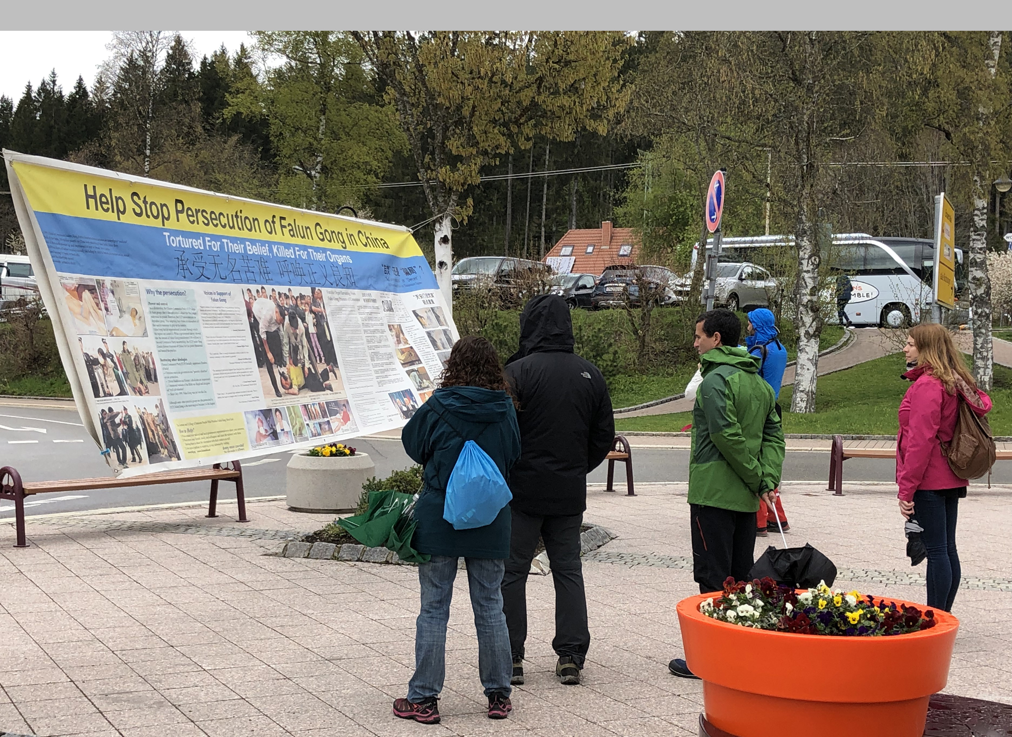 在景区里冒雪游览的几位大陆游客对法轮功学员感慨德国的新鲜空气和青山秀水。当法轮功学员提到“三:退.”保平安时,开始有人说:“我们是爱国的,不参与政治。”学员说:“爱国是对的,但是爱国不等于爱党!中共把中国大好河山糟蹋得民不聊生,历史上害死了八千万无辜中国民众,六四屠杀学生,近二十年镇压法轮功,甚至大量活摘法轮功学员人体器官。你如果爱国的话,肯定反对中共这些祸国殃民的罪恶,坚决抵制中共的邪恶政治。人对是非、善恶要有个选择,摆放自己位置。长期以来,中共就是故意混淆中国和中共这两个不同的概念,以兜售其奸。”