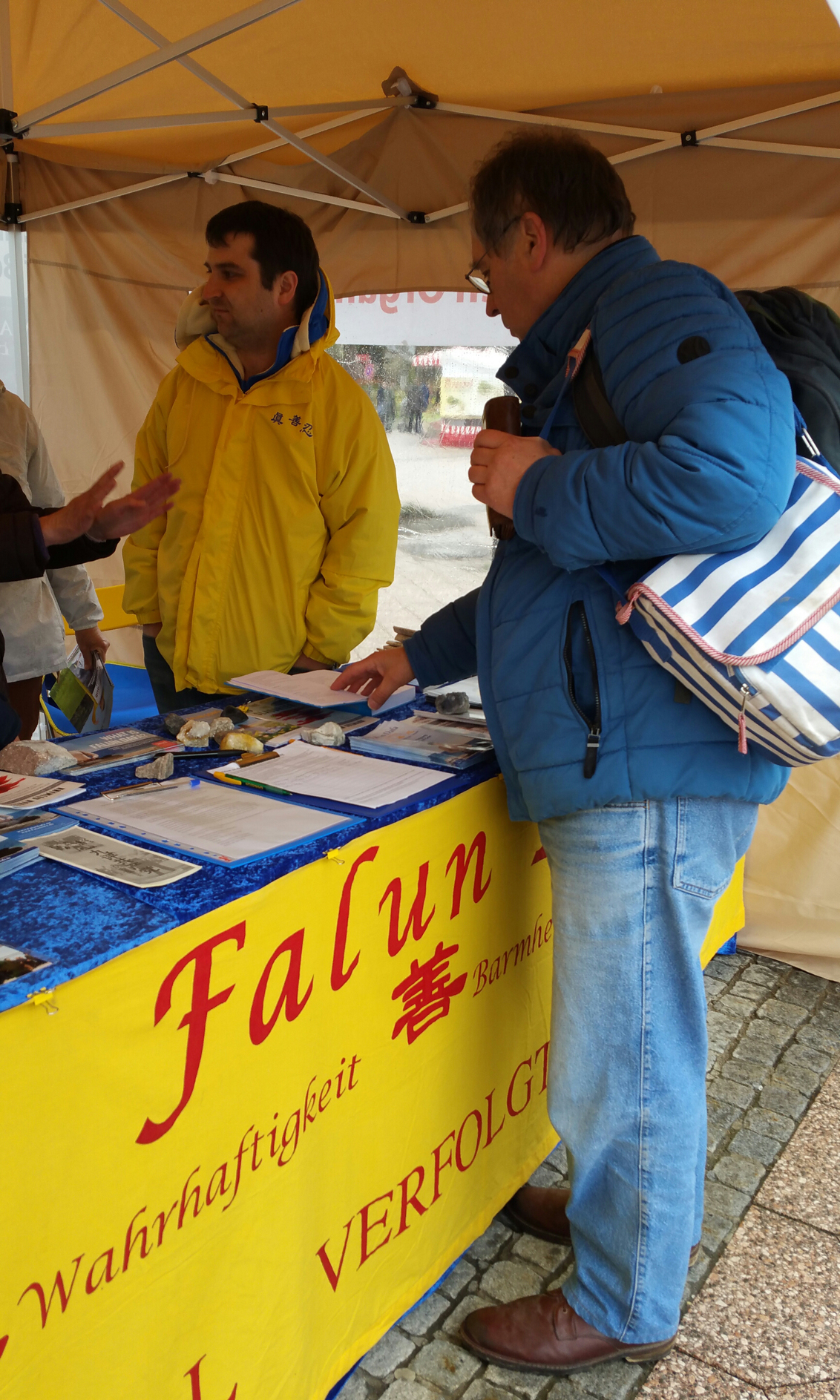 ![]() 图7:来自德国Karlsruhe的Bley先生,看到信息台上放着《转法轮》,拿起来翻看了一下目录,里面的话题立时引起他极大兴趣,于是当即买了书。 |