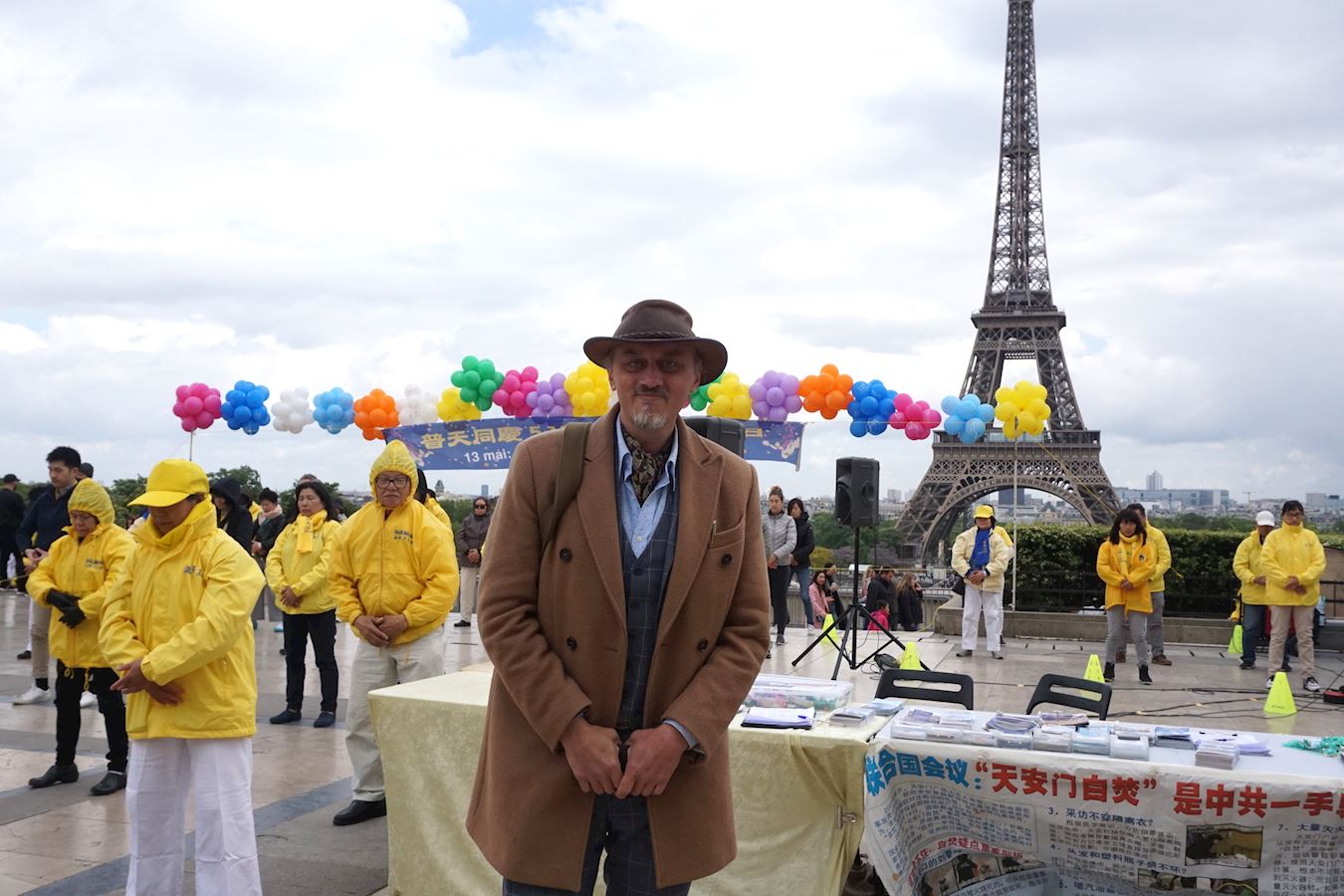 二零一七年得遇大法开始修炼的亨利·米歇尔(Henry Michel ),今天他是第一次参加法轮大法日活动。他说有机会让外国游客和巴黎人看到具有中国传统特色的中国舞蹈和服装,了解法轮功的美好,自己感到身心愉悦。