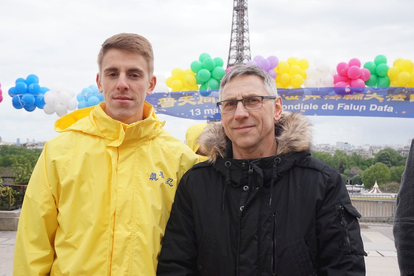 居住在大巴黎地区的佩尔蒂埃·岗丹(Pelletier Quentin)是四年前自己在网上发现的法轮大法并开始修炼,后来家人和很多朋友也因他开始修炼,并在自己的城市建立了炼功点,现在参加的人数越来越多。今天他和父亲佩尔蒂埃·达尼尔(Pelletier Daniel)一起来参加法轮大法日活动,感触良多。父亲因第一次在这样的公共场合展示功法,开始有点不习惯,后来慢慢地也能静下来了。他说能和这么学员一起炼功,感觉和在家里大不相同,还可以给过往行人了解法轮功的机会,心中很高兴。