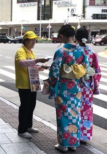 五月初正值日本新王继位及新年号[令和]开始使用。这一庆祝恰逢黄金周连休,所以今年日本破天荒地出现了十连休的大假期。而古都京都本来就是一个世界级的旅游观光城市,因此这期间就显得人流量更加大。周边的法轮功学员充分利用这一大好时机向民众讲真相。