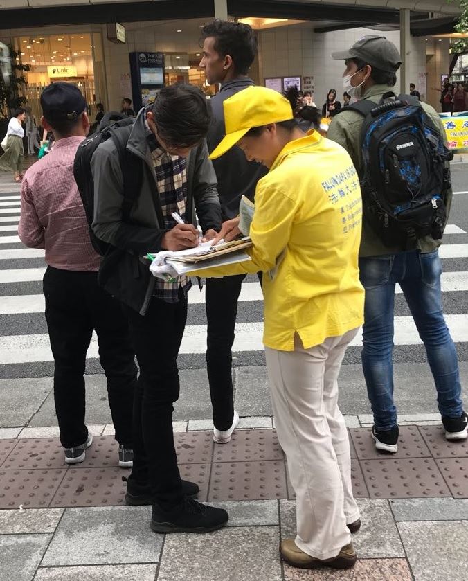 一位在征签表上签了名的日本女士握着学员的手诚恳地说:“最后胜利的一定是真相!这个期间虽然艰辛请你们一定要坚持下去。”