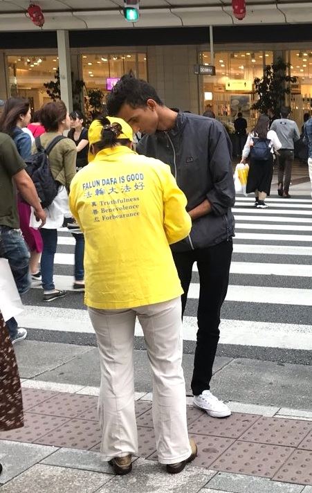 一天中午一位年轻的女士走过来主动说她要签名,同时说她知道共产党太坏了,它做的坏事现在已经殃及全世界了。如果说让她捐十万日元能对停止迫害有帮助的话,她马上就捐。学员谢绝了她的好意。通过进一步的交流才知道她原来是中国人,最后她顺利的做了三:退.。