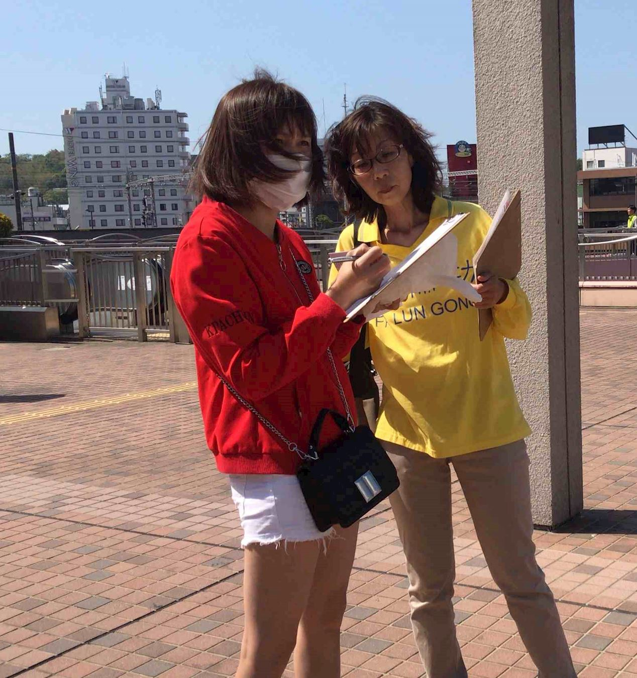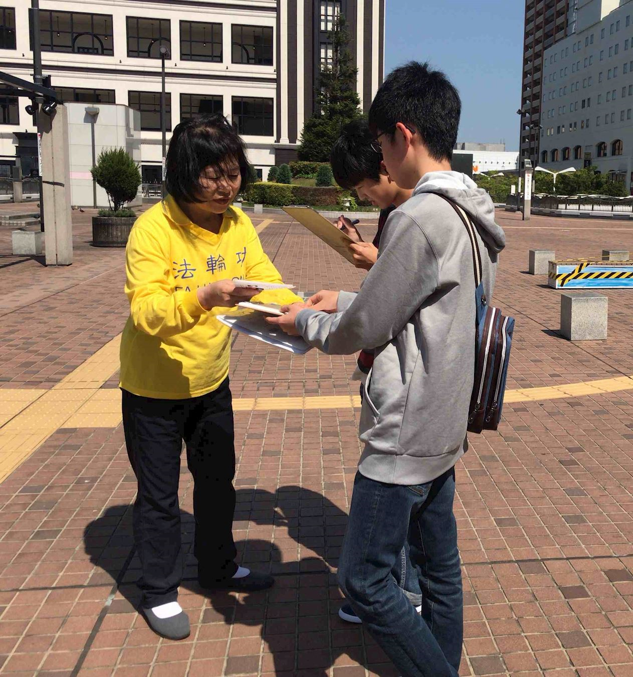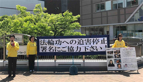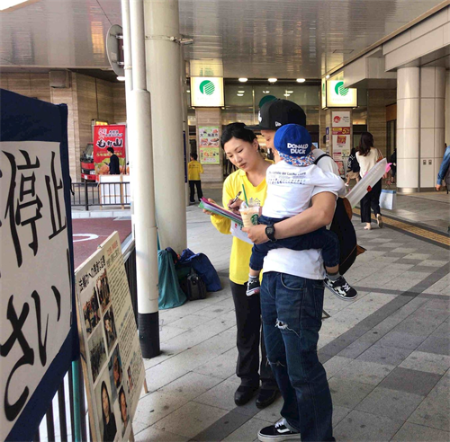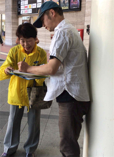 此次学员们利用五月黄金周来到了距离熊本二百公里的山口县下关市,呼吁下关民众签名举报江泽民。学员们打开横幅和真相展板,使用扩音器向行人呼吁举报江泽民的联署。有的静静的听着学员的广播说明;有的接过联署传单,很多人向学员了解更多的信息之后纷纷签名举报江泽民。
