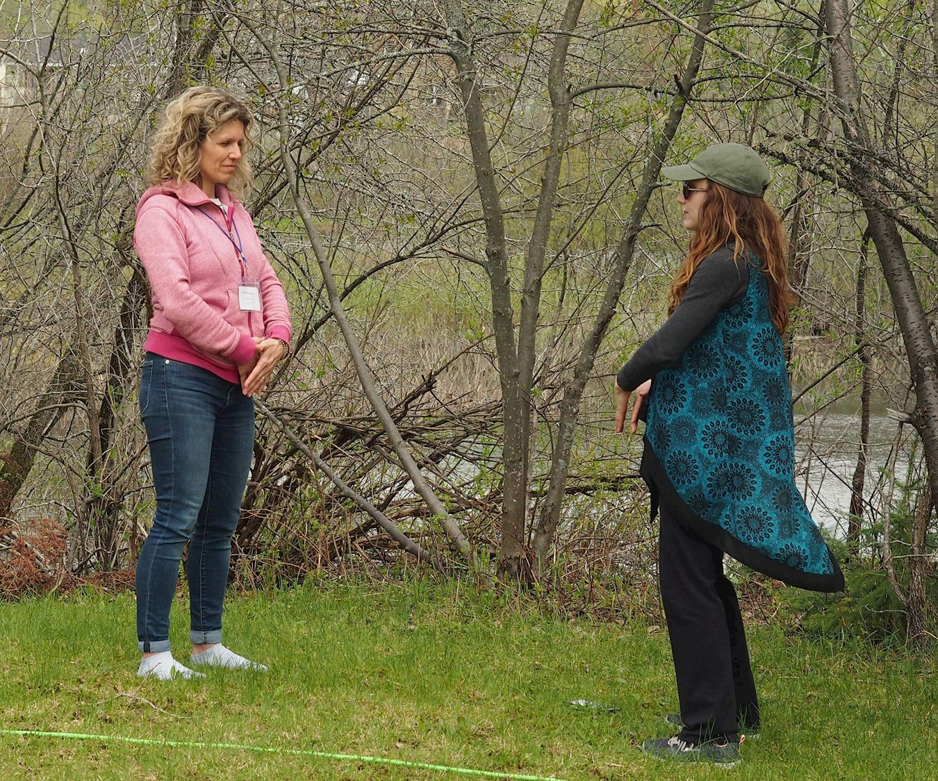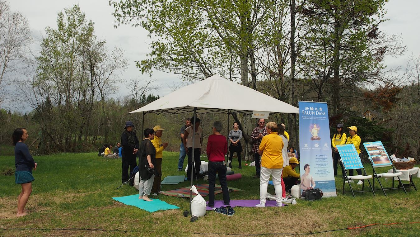 主办方特意在靠近河边的草地上,为法轮功学员免费提供了一大块宽敞场地,以便于为民众教功。活动组织者布赫博涅(Marc A. Bourbonnais)来到展位上向法轮功学员们表示感谢,称赞法轮功学员带来祥和,“谢谢你们来参加,今天早上我非常紧张,但我感受到了你们的能量,让我放松下来了。”
