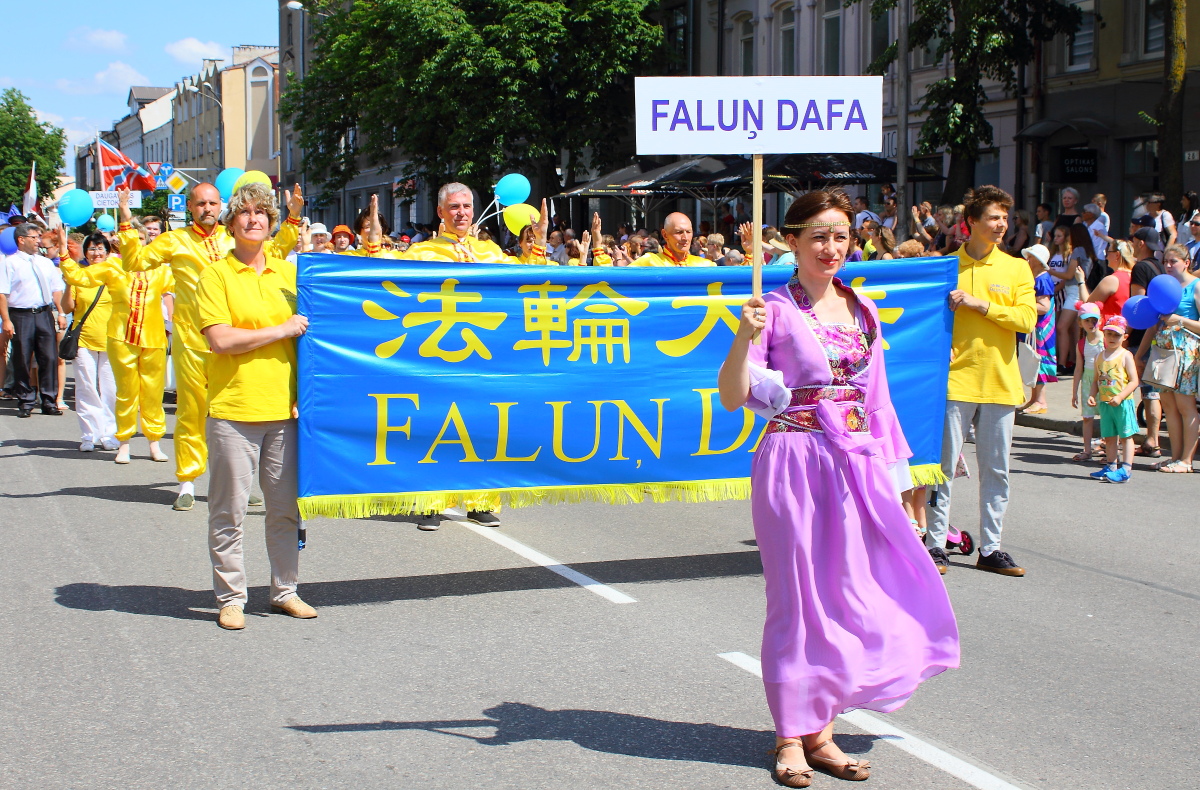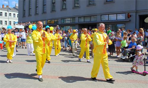 来自拉脱维亚的法轮功学员们六月八日星期六来到陶格夫匹尔斯市,参加了当地的游行庆典活动,让更多民众了解来自中国的古老修炼方法。