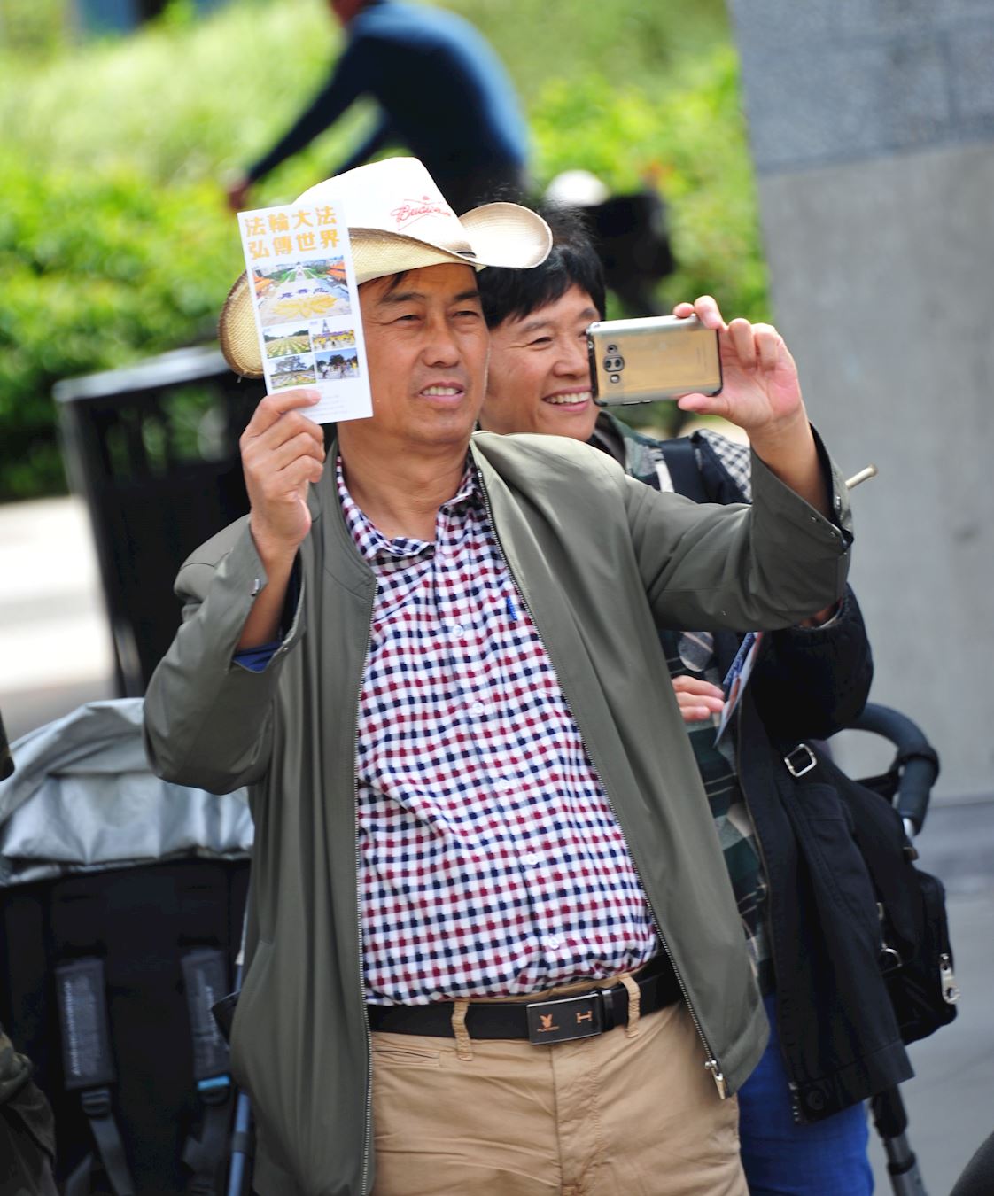 陆先生(化名)和太太是从大陆来温哥华探亲的人士,刚来不久。陆先生坐在路边看游行,当看到法轮功游行队伍走过来时,他从路边的座位上站起来走向队伍,举起右手,挑起大拇指对着法轮功的游行团体挥动,表示欢迎和赞扬。