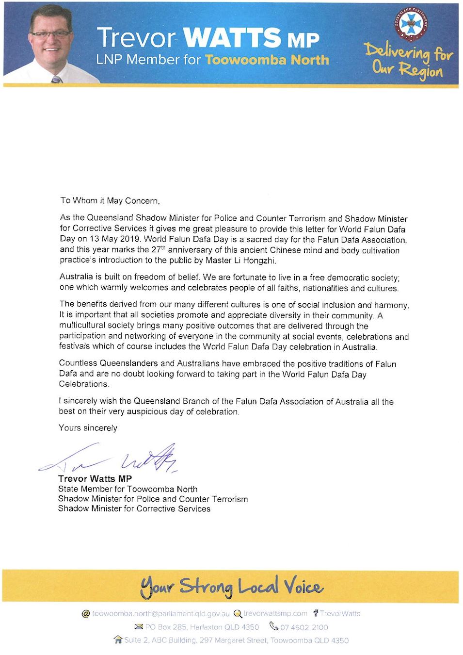 昆州图文巴北部(Toowoomba North)州议员特雷弗·瓦茨议员(Trevor Watts MP)给昆州法轮大法学会发来贺信。译文如下: