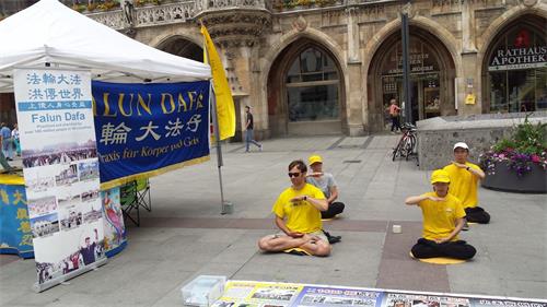 六月八日和六月十二日,法轮功学员在伊萨门(Isartor)举办活动,给过往的中国民众讲真相。伊萨门是旅游大巴的停车站,上下车的大陆游客非常多。人们一下车就能看到炼功的法轮功学员和《法轮大法好》的条幅。当人们看到法轮大法弘传世界的展板很感兴趣,不少人围着观看。还有人对西方学员炼功很感兴趣,很多人拍照留念。