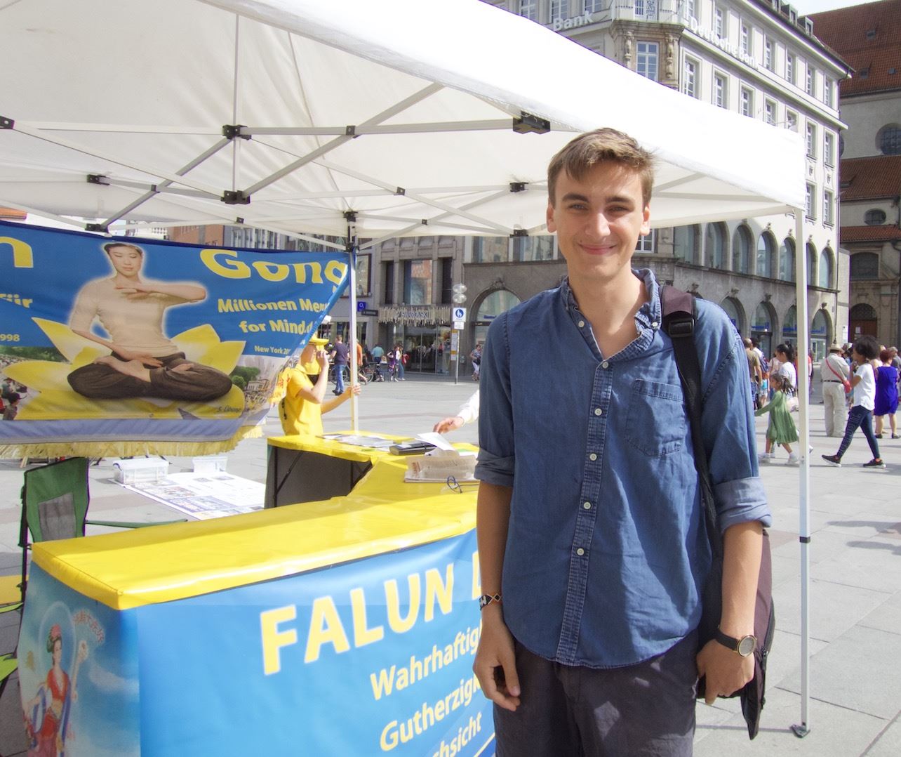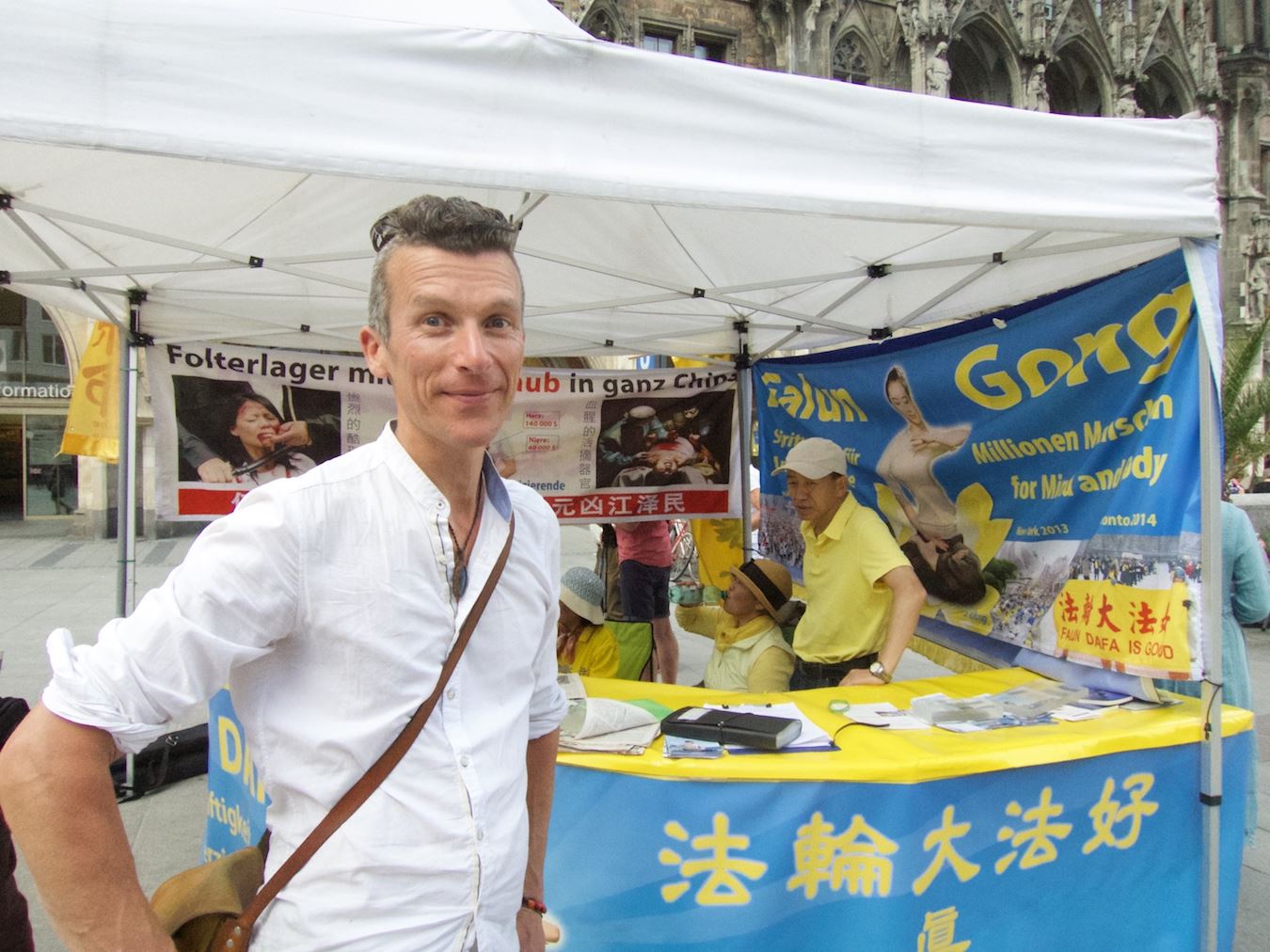 保罗·弥布容(Paul Milburn)毫不犹豫的走向信息台要求签名,“中国的集中营不光是关押法轮功学员,也关押新疆人,绝对恐怖。”保罗在慕尼黑附近的达豪集中营展览馆工作,他说自己听说过法轮功被迫害的事,“这(納粹集中营)曾在德国出现过。我在达豪集中营(展览馆)工作,向人们讲述在那里发生的事情。类似的事情现在还在世界上发生,太可怕了。”