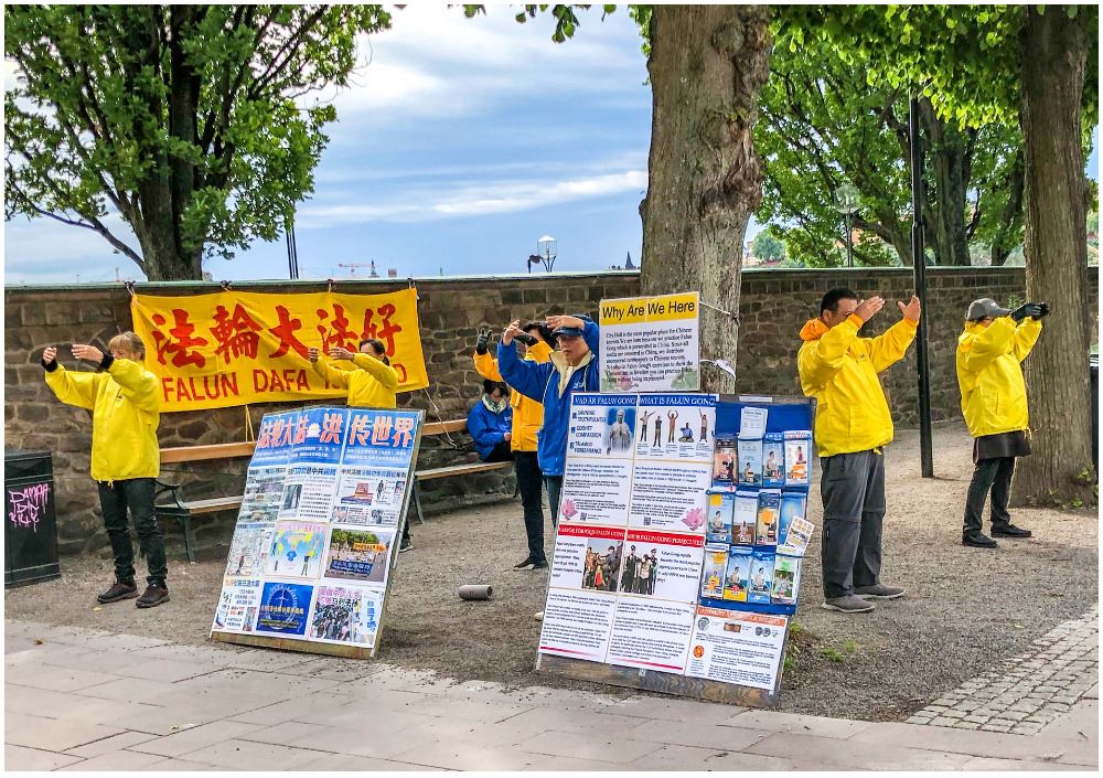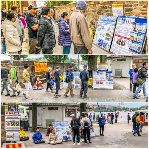 ![]() 图2~4:斯德哥尔市政厅前的法轮功讲真相点,每天都有学员在这里向来自世界各地的游客介绍法轮功,展示平静祥和的法轮功的五套功法,同时向中国大陆游客发放揭露中共迫害的真相资料,吸引很多游客前来了解真相。 |