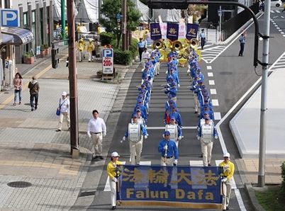 第一天的游行出发地是爱染(aizen)公园。出发前,神戸市议会议员上畠宽弘(orihiro Uehata)先生前来声援学员们。上畠先生直到两年前一直是镰仓市议会议员,在镰仓市任职期间,协助市政府修改脏器移植相关法案意见书,当时,中国大使馆对其多次施压,但他还是向市议会提出了意见书,并得以通过。他说:“意见书的内容虽是有关脏器移植的修正案,但在这个基于地方自治法99条的公文书上,明确有‘对法轮功学员的迫害’的注明,‘法轮功’一词被明确注明在日本市议会公文书上,且法案被通过,这在日本是独一无二的。”