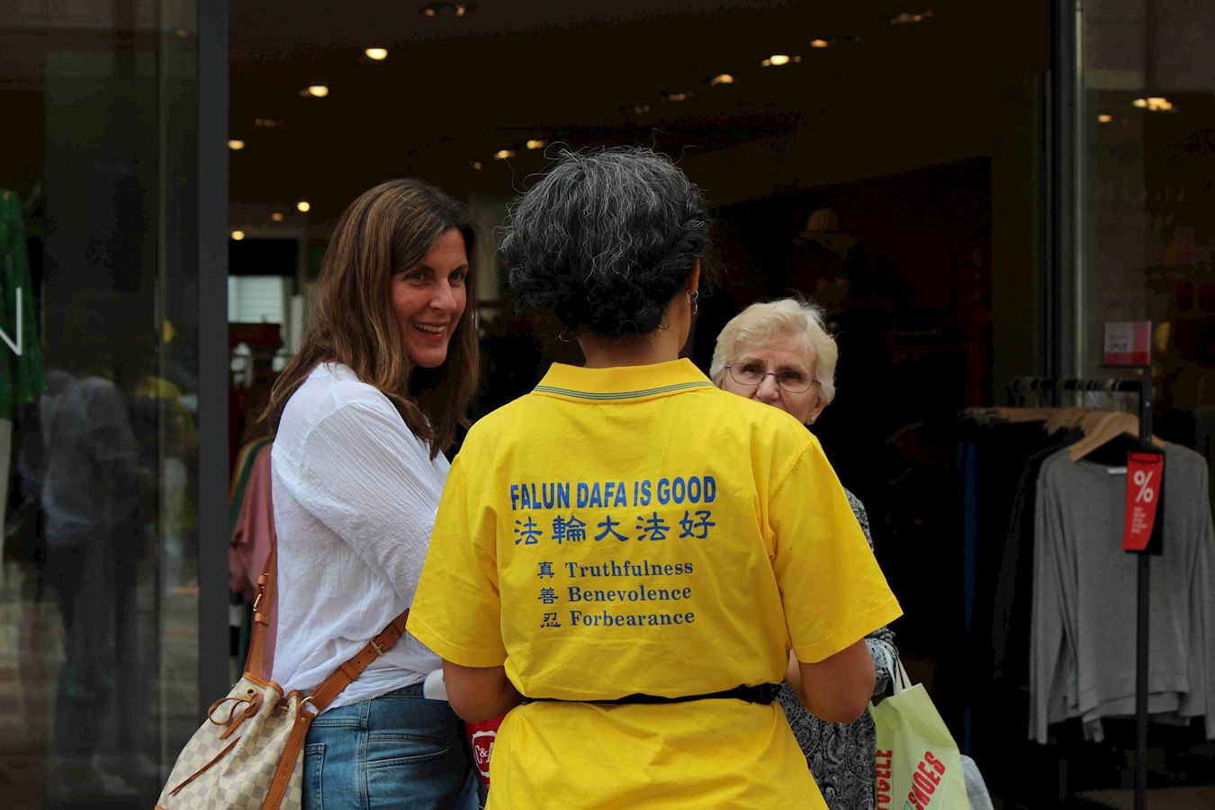 从事秘书工作的索尼娅(Sonja)女士从学员那了解到中共对法轮功学员的迫害,特别是活摘器官的罪行。在签名支持法轮功学员后她谈到:“在二零一九年的今天,根本就不应该还有这样的(罪行)发生,人们被虐杀,被操控,不能有自己的权益,他们的意愿被忽略,这就象希特勒的时代,怎么能有这样的事情发生?让人无法接受!特别是活摘器官,人有生存的权利,我们不能容忍这样的罪行!”