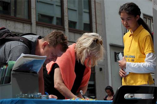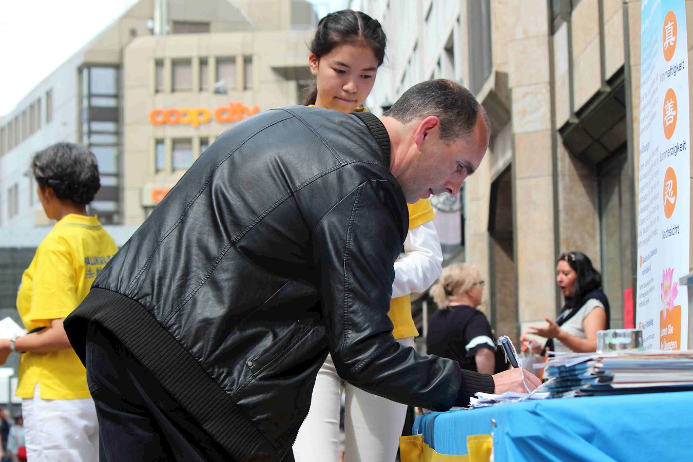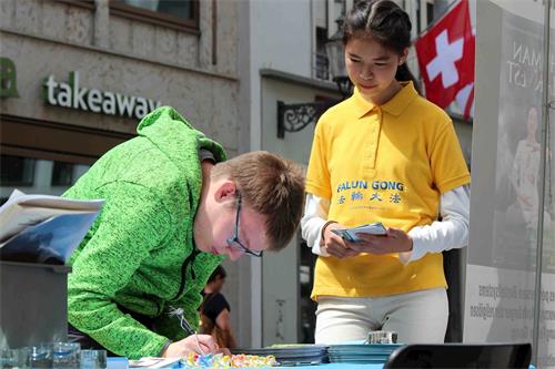 在苏黎世州银行从事科技工作的马丁(Martin)和学员长时间交谈后,要求签名制止中共活摘罪行:“活摘器官的罪行侵犯人权,违背人性,我们在瑞士根本无法想象。”“我看到你们的付出,我能感受到为了中国的民众我们应该来关注这一主题,来制止活摘器官的罪行,这是侵犯人权的罪行。“