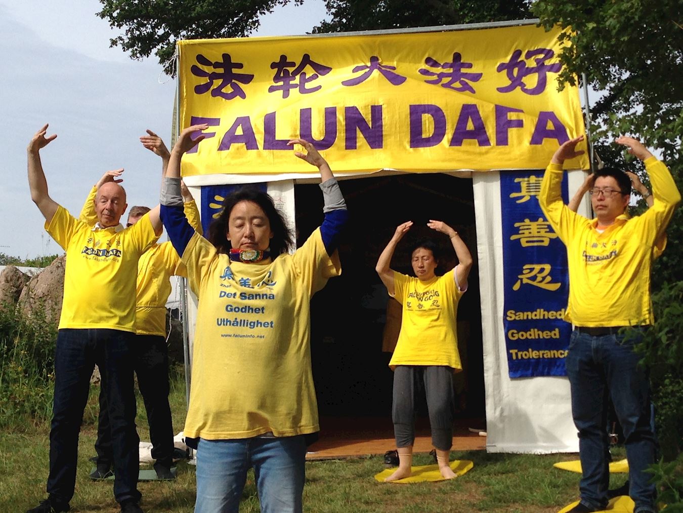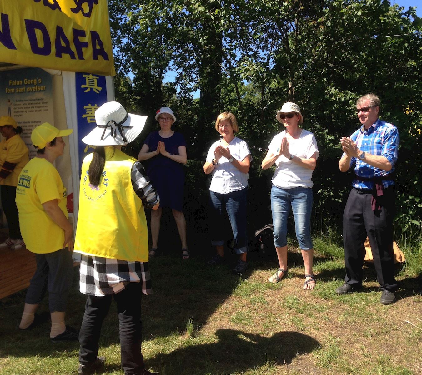 周六上午刚开始活动,一位女士走进学员展示功法的行列,在后边来随着音乐跟着炼了起来,动作很熟练。炼完后她告诉学员,在“人民峰会”上她也有展位,在繁忙中抽空来这里炼功。她说:“炼完后疲劳消失了,头脑清醒,身体放松,如果下午有空还来一起炼。”她以前在哥本哈根炼功点学法轮功,知道法轮功真善忍很好,体验到修炼能达到身体健康,思想纯净。法轮功学员是很好的人,善良、理性、乐观。