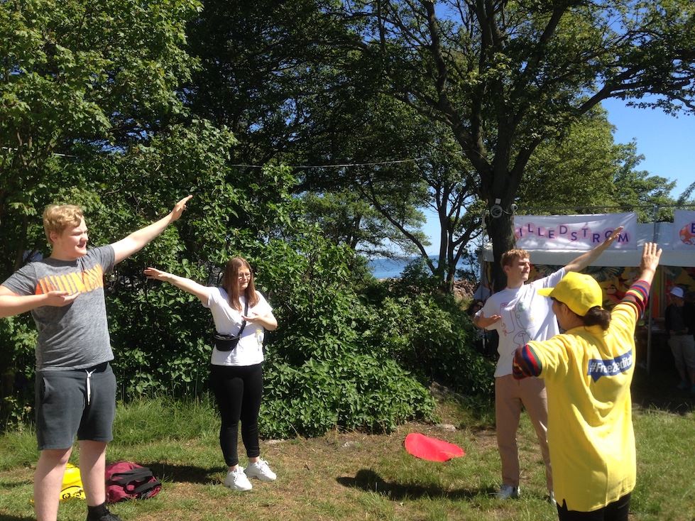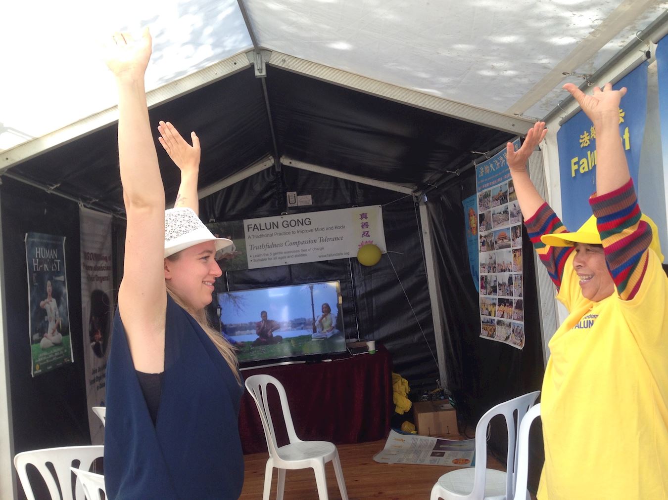 三位在校高中生被优美舒展的法轮功五套功法所吸引,他们随即驻足观看。看到“简单易学,免费教功”的信息,他们非常高兴,跃跃欲试。阳光下,三个年轻人把五套功法很快学了一遍,感觉很舒服,很放松。“能告诉我们更多的法轮功的事情吗?”学完功法动作,他们又提出一个请求。学员告诉他们:法轮功是一种传统的佛家修炼功法,在中国一九九二年由李洪志先生传出,遵循真、善、忍原则,修心、向善做好人。很多人炼法轮功后疾病消失了,身体健康,而且思想更纯净。原来他们要在“人民峰会”期间选一个最感兴趣的课题写报告,然后给班上同学介绍。他们选择了法轮功作为他们的项目课题。