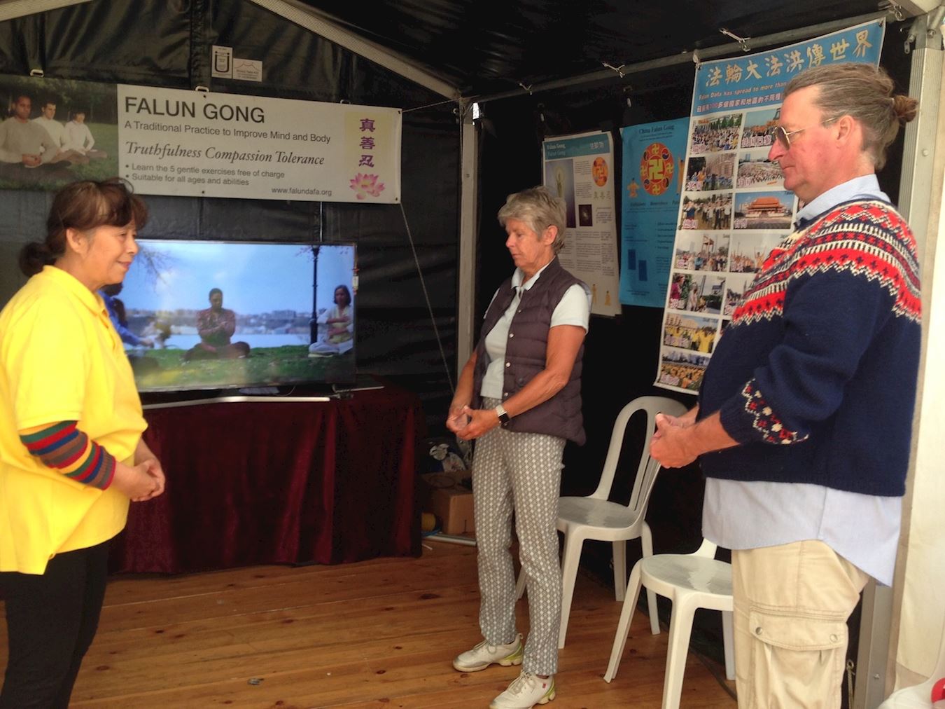 一位记者路过法轮功的展位前,他接过资料后与学员交谈。他曾在中国工作,知道一些有关法轮功的情况,他亲眼目睹法轮功学员拉横幅的情景:“那是二零零三年,我在北京,一天在天安门广场看到几个法轮功学员拉横幅,仅仅几秒钟就被警察抓走了。瞬间就消失了,非常快。”这一场景就像刀那样刻在他的脑中,非常深刻。他说:“我感觉很不好,太糟糕了,非常恐怖。我支持你们,这种违反人权的迫害要制止。”