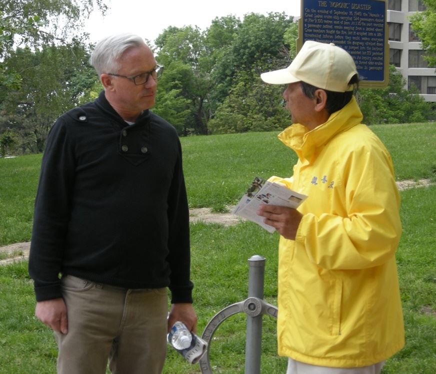 来自法国的马库斯(Marcus)先生是一位教育家,在中心岛上认真听完了学员对法轮功真相的讲述。马库斯先生说:“法轮功学员只不过是炼炼功、打坐,就被中共迫害,这实在是太不公平了!我知道在中国存在着对各种信仰的人群、族裔的不同程度的迫害,法轮功学员应该有信仰的自由,他们只是在锻炼身体,而不是要反对政府,就像练武术的群体一样。我知道他们不是武装暴动,所以毫无疑问他们可以自由的修炼。法轮功学员有权利自由的表达他们的信仰,因为他们的信仰没有伤害任何人。”
