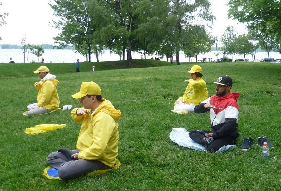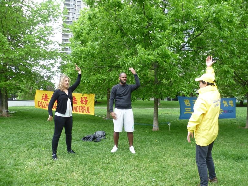 来自法国的路易斯(Louis Laviolette)和艾妮莎(Anisssa),看到法轮功学员在炼功就十分感兴趣,并表示想学功法。“我已经在多伦多居住一年,今天带着艾妮莎来多伦多郊游。最后我们来到了湖边,能遇到你们,学习功法,这真的是缘份。”