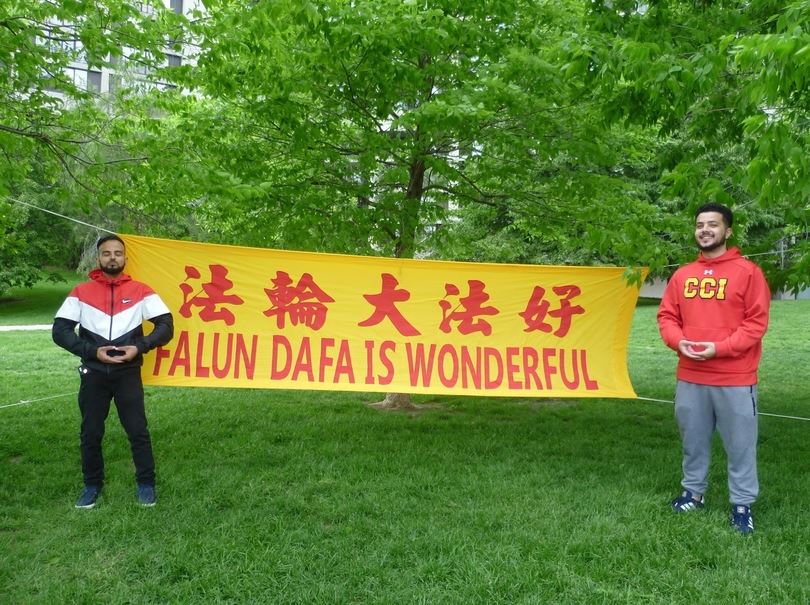 ![]() 图6:沙阿(左一)和亚赫亚(右一)在“法轮大法好”横幅前合影 |