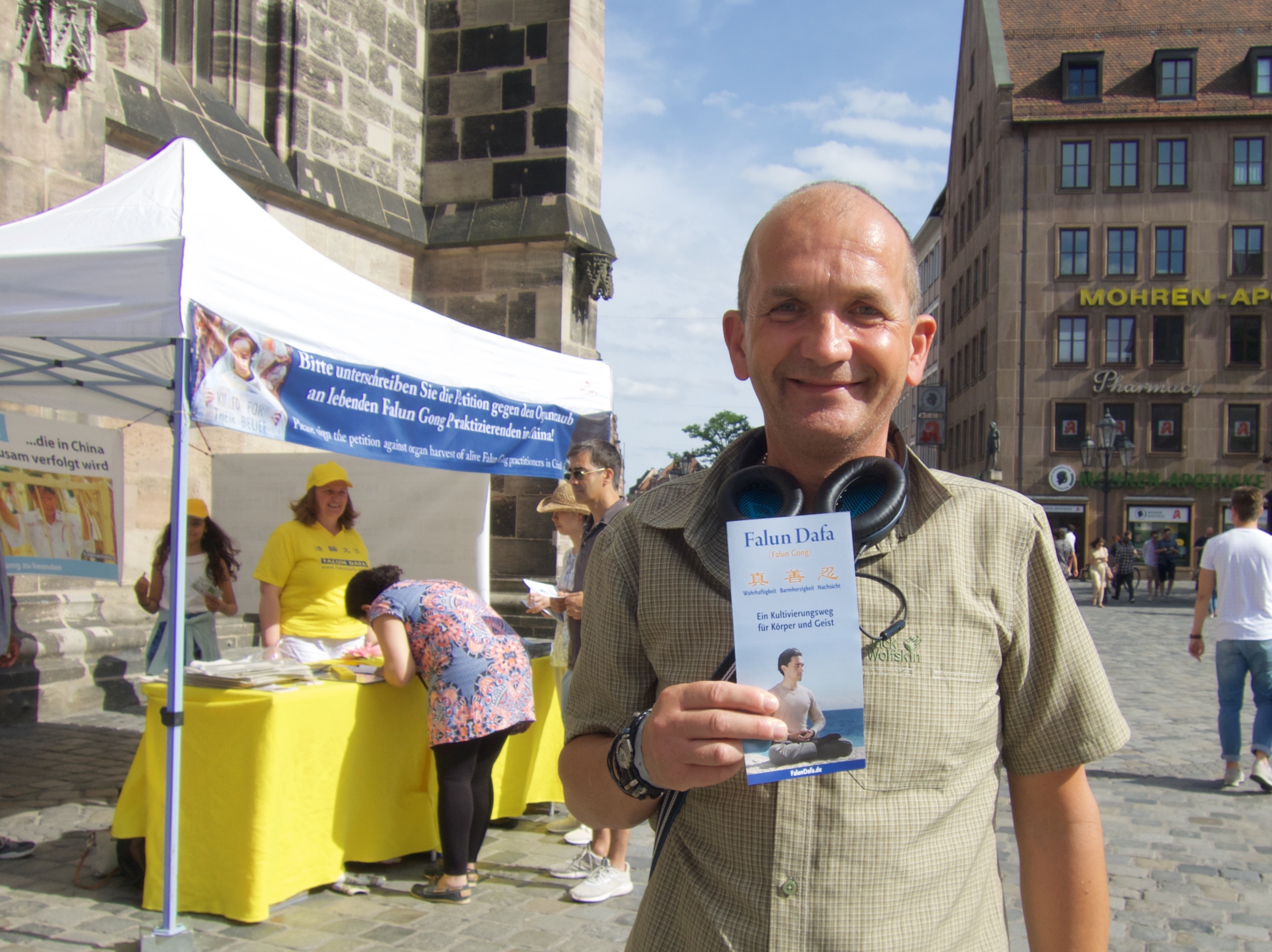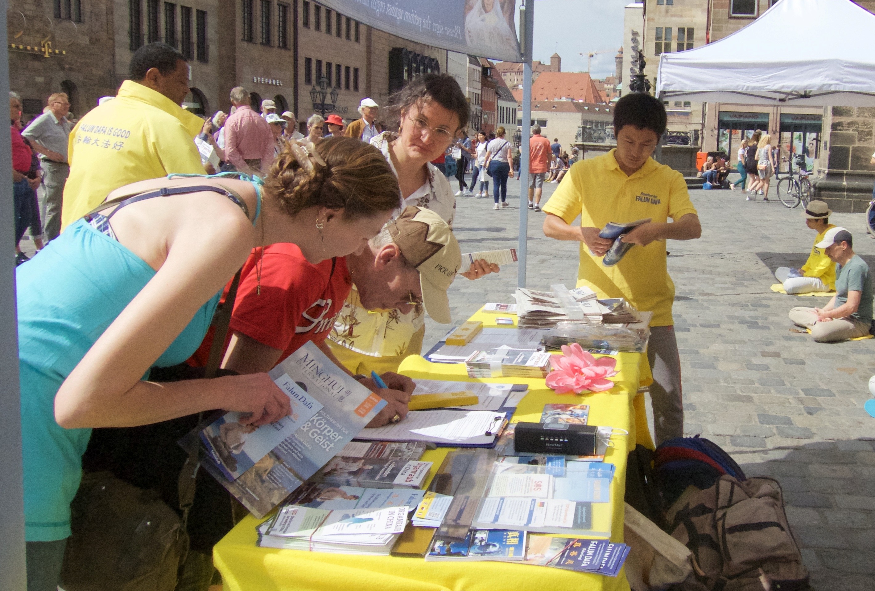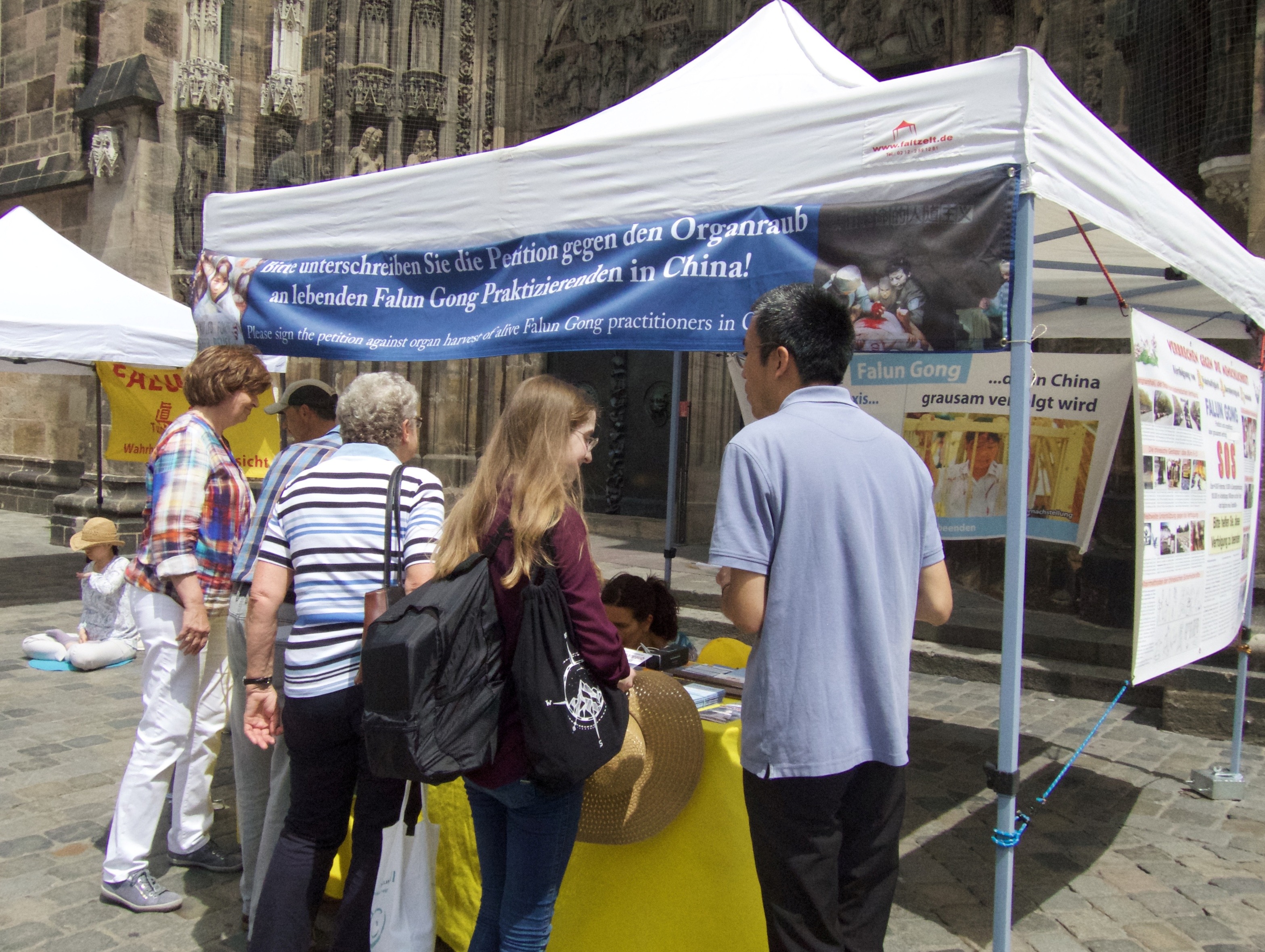 来纽伦堡旅游的德国人齐默曼夫妇(Zimmermann)跟法轮功学员交谈之后签名反迫害,“我不愿看到人们被杀害,只为了有钱人能继续活下去。”先生说,太太也认为,“这损害了人权,因为人们由于这个原因(器官需求)没有选择的被强摘或被杀害,只因为手中有权力,就将人(的器官)摘取,这是不行的。”