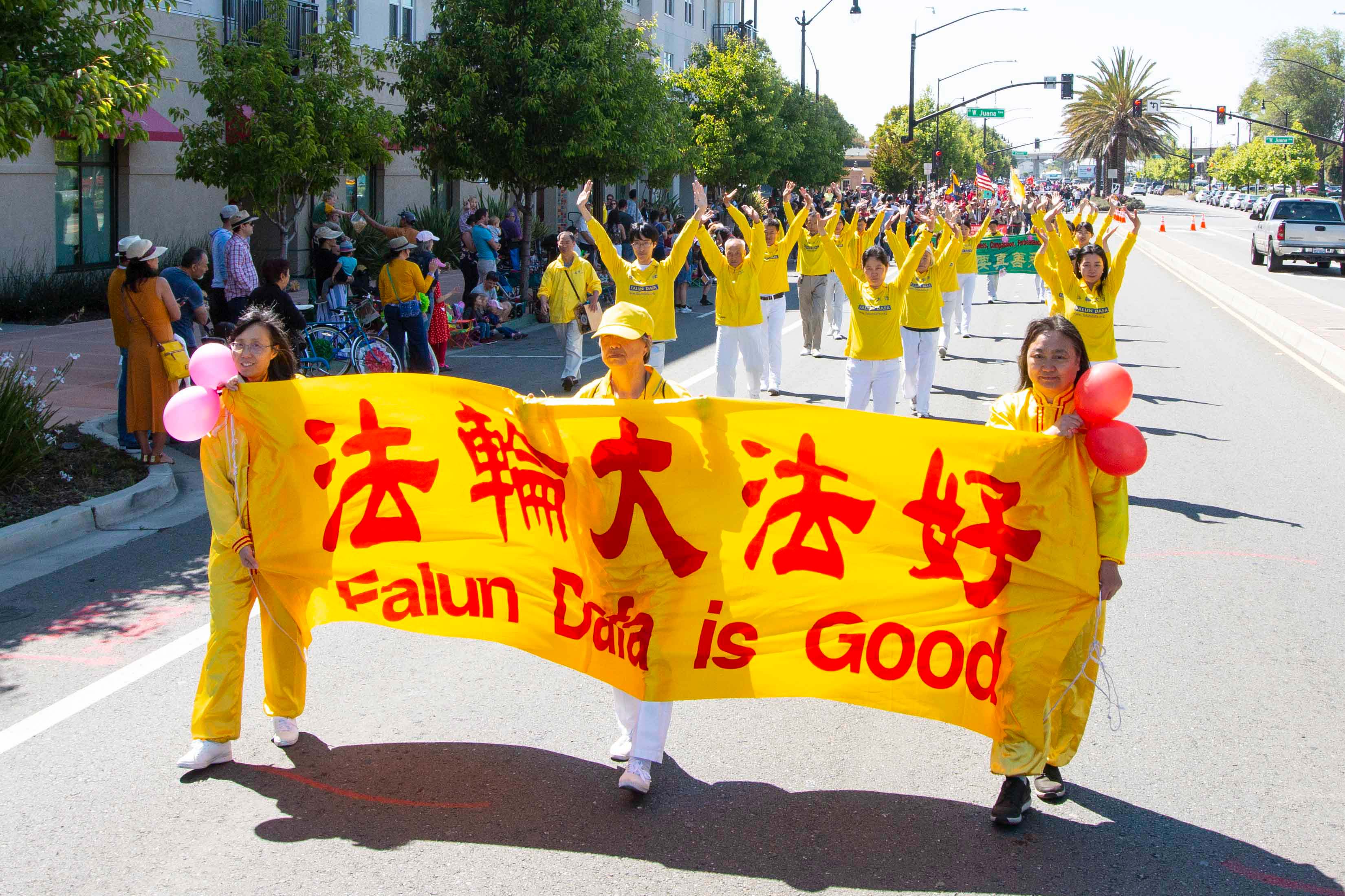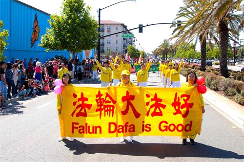 当法轮功学员的队伍进入主席台前时,主持人向观众介绍:“这是旧金山湾区法轮功学员的队伍。法轮功是改善身心健康的修炼。”