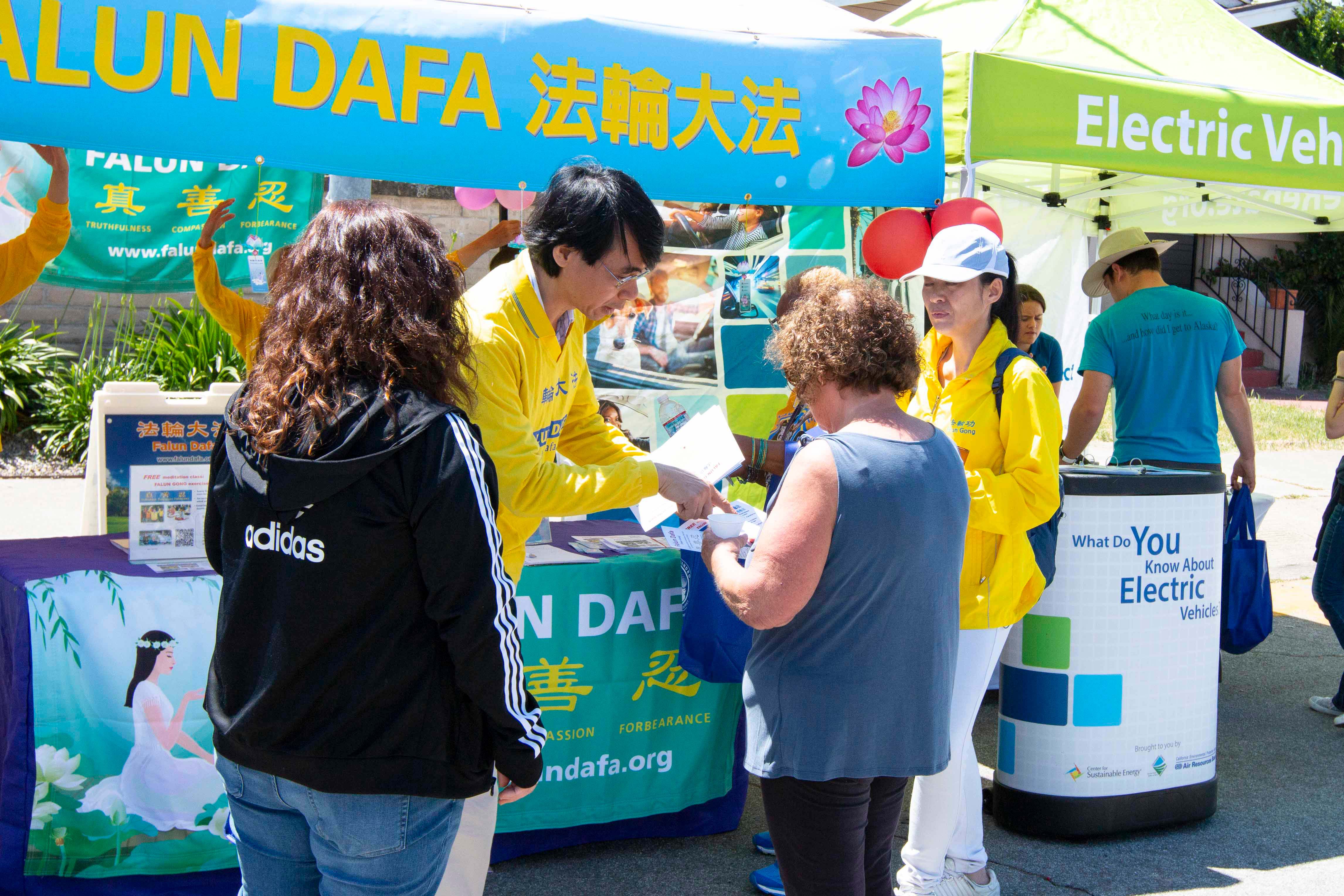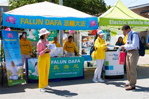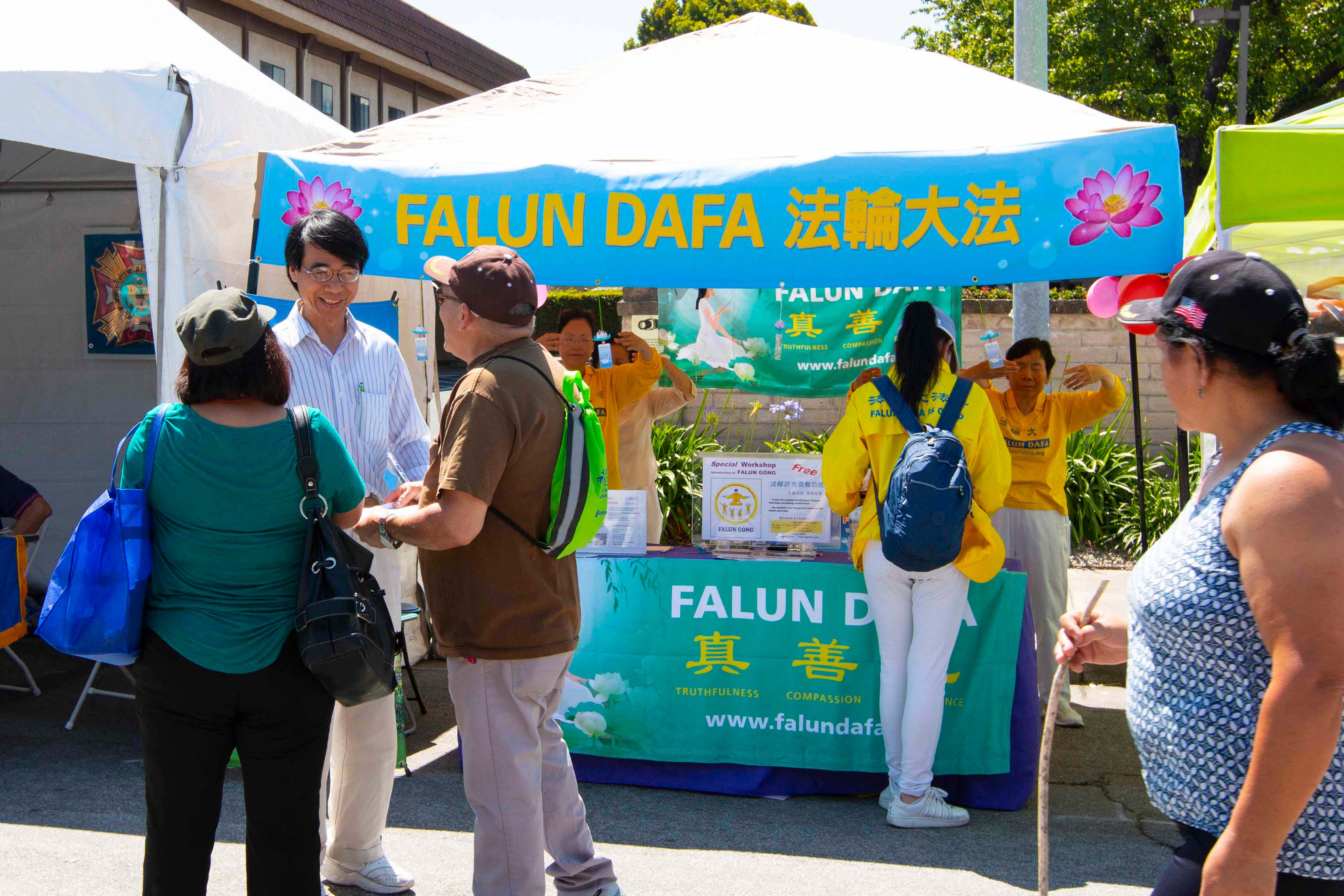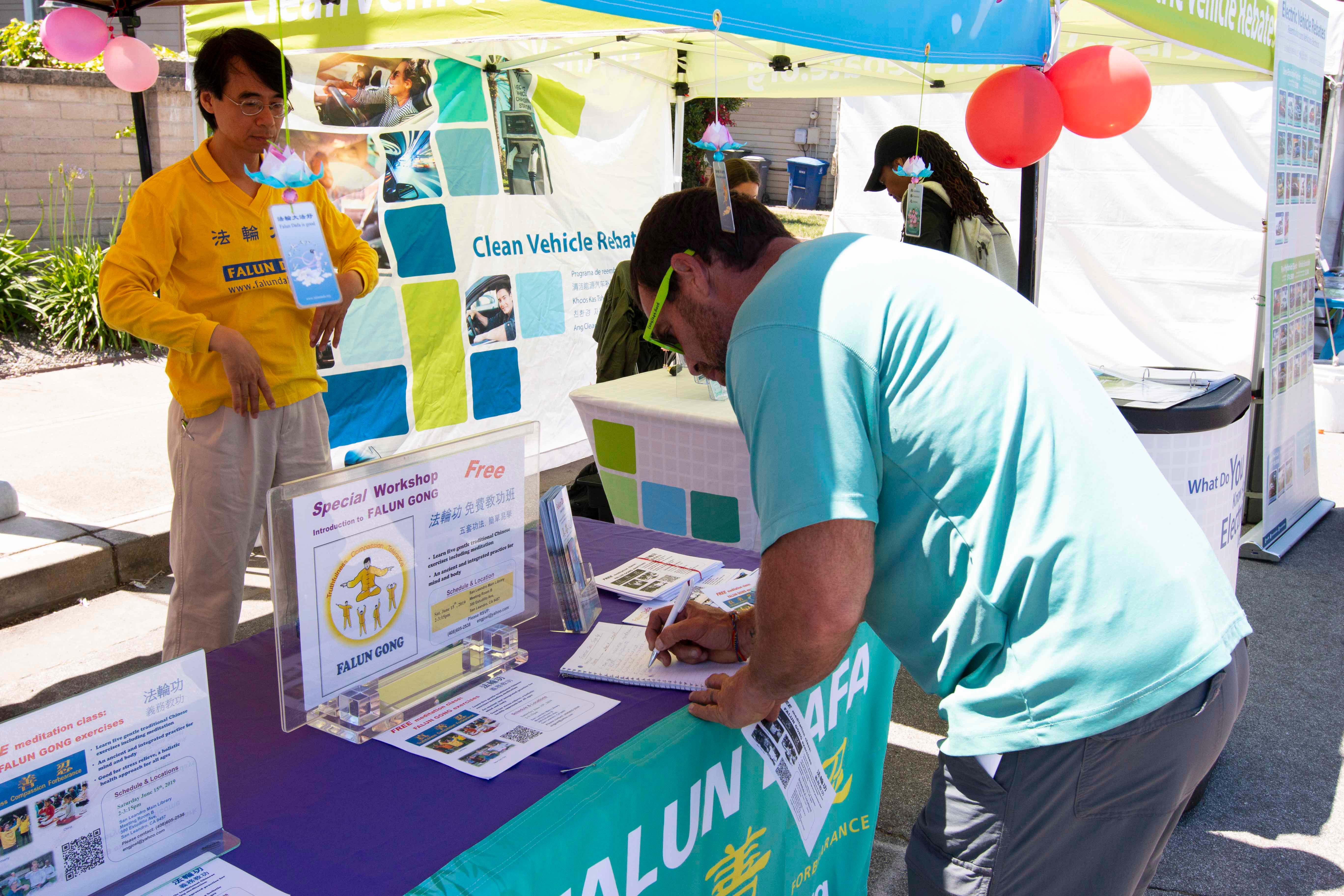 游行结束后,法轮功学员还设立了真相摊位。不少人对进一步了解法轮功感兴趣,踊跃报名参加将于六月十五日举办的法轮功教功班。