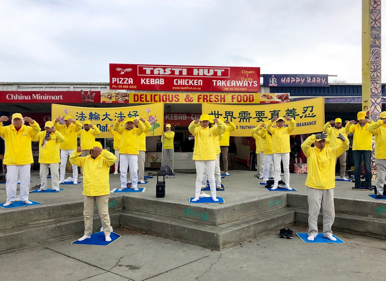 ![]() 图1~2:法轮功学员在新西兰奥克兰的南区炼功,传播真相。 |