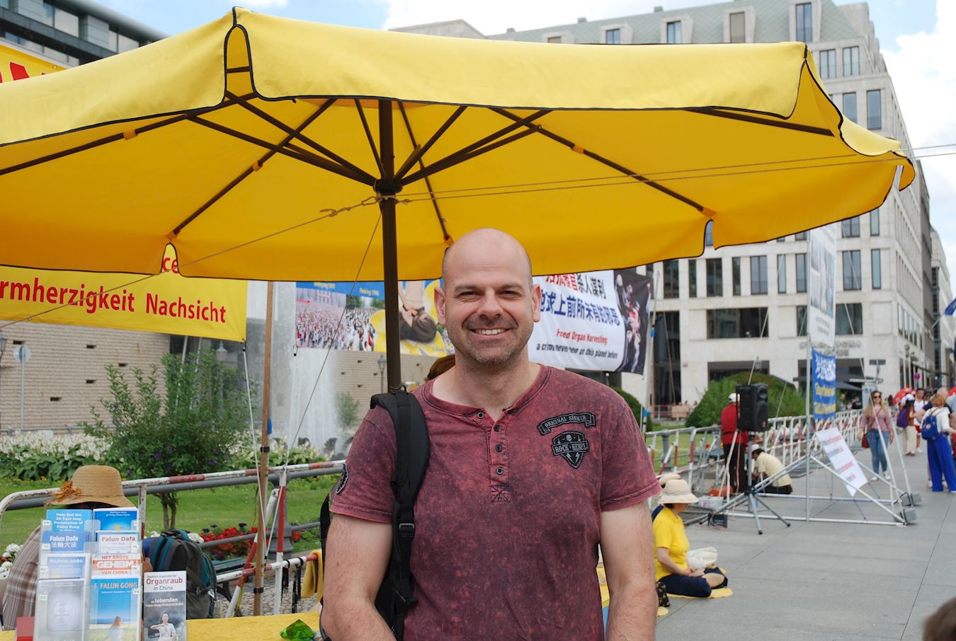 一位不苟言笑的中年男子带着他的女儿站在横幅正面看了很久,他从一个女学员手里接过传单之后,雕塑般一动不动地阅读。从头至尾读完最后一个字,抬起头看着横幅,凝固在原地一般。一直到学员告诉他说:“您可以在征签表上签字,帮助法轮功学员制止迫害。”他才有点回过神来,拉着女儿走到展桌前。他说,“难以想象!我完全不能想象,没有得到别人的同意,就能够从一个人的身体上摘取器官,这是我想都不敢想的,闻所未闻。”他神情严肃,急促的语气中透着激动和愤怒。他叫布荷勒(Buechler),是柏林人,多年前去过天津,对中国的印象很好。他连连说:“没想到在中国有这样的事。”他向法轮功学员提了许多问题,非常关心德国政府有没有向中国施压,有多少效果,对收集迫害证据有没有提供帮助。