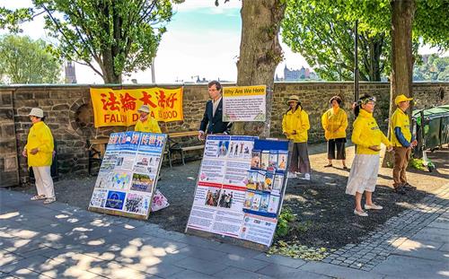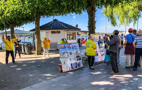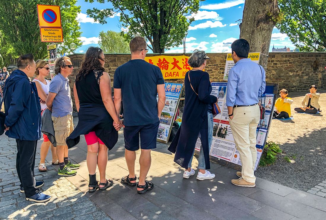 六月二十一日至二十三日这个周末,在通往斯德哥尔摩市政厅入口处的游人如织,来自世界各地的游客显得特别的多,首先映入游客眼帘的是法轮功学员宁静祥和炼功的场景,悦耳的音乐、美好的祝福,很多游客驻足、拍照、摄影。当人们仔细从真相展板上了解了法轮功弘传世界的盛况,就想了解更多有关法轮功的信息,索取各自国家语言的大法传单,并与法轮功学员深入交谈。